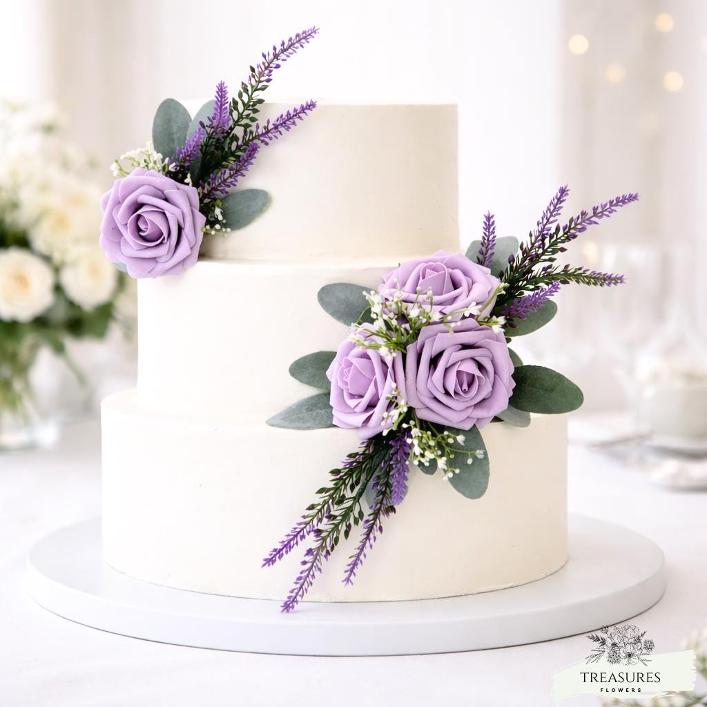 This cake topper comes in 2 separate pieces and is made from stunning realistic foam roses in lavender, lamb's ear leaves, baby's breath and Individual Sprigs of Faux-Lavender.