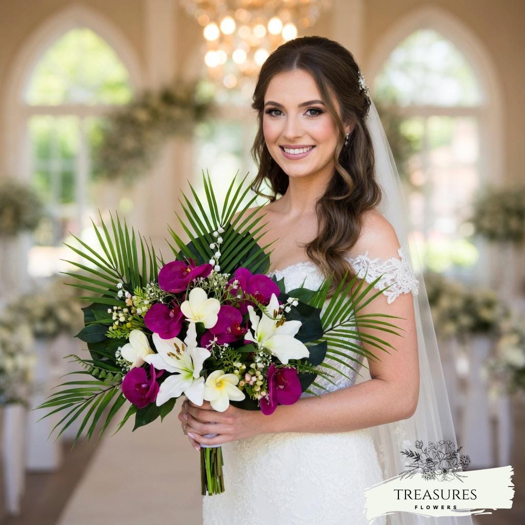 These beautiful and elegant front face bouquet is made with Fuchsia Orchid, White Lilies, White Plumeria and a a mix of beautiful fillers together with tropical greenery.