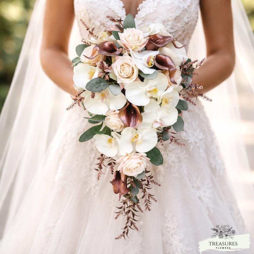 beautiful and unique Cascade Silk Bridal Bouquet, with Rose Gold, Calla Lily and Fillers, Blush natural touch Roses, White Orchid and lambs ear greenery. This Bouquet measuring approximate 18" long and approximate 10" across.