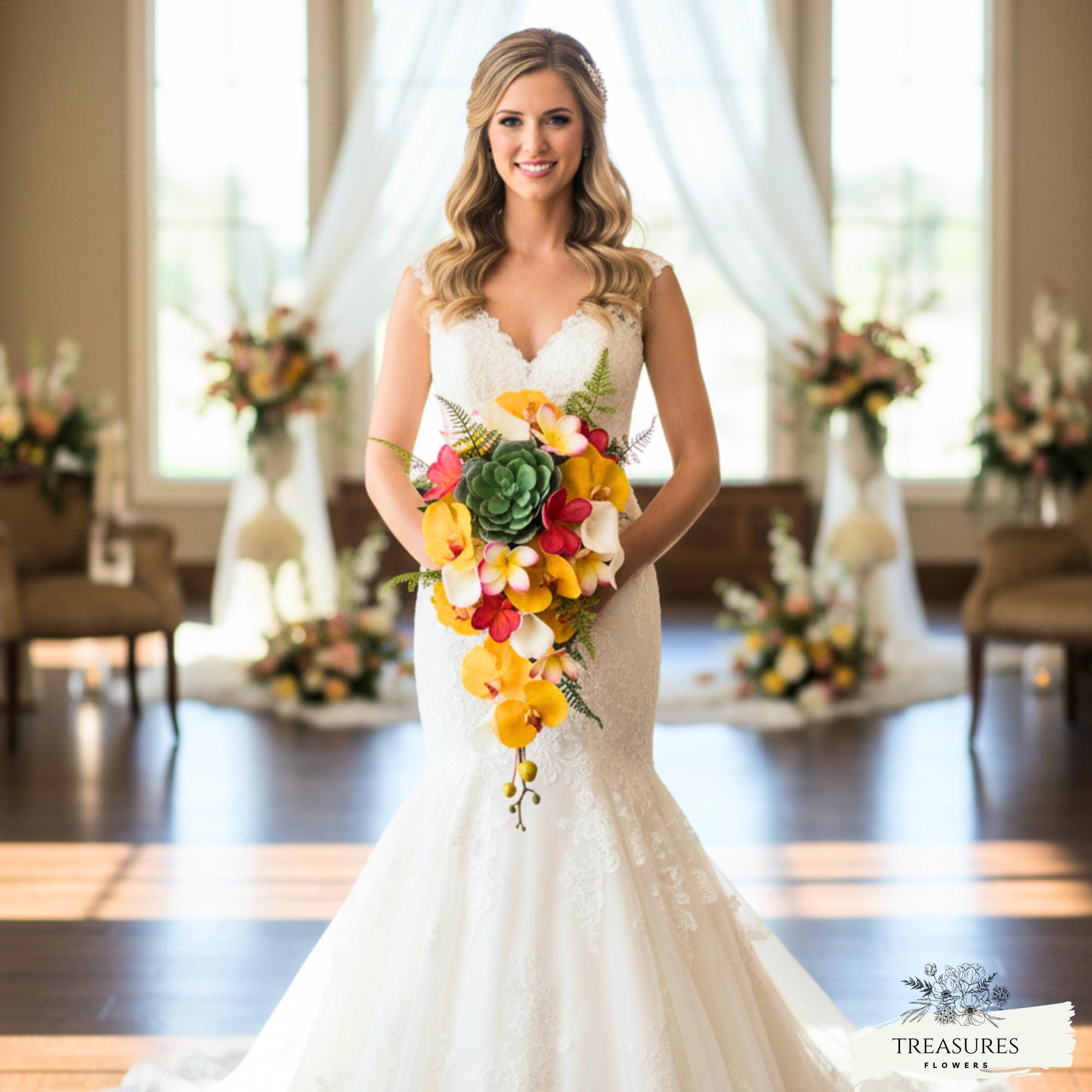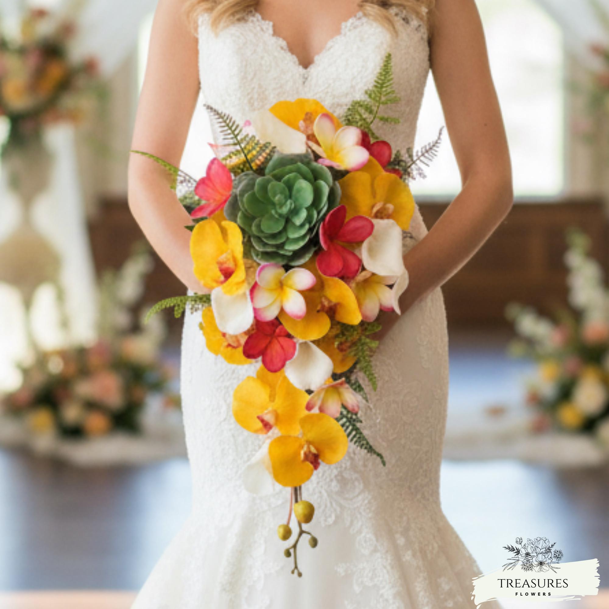 Beautiful and unique Cascade Silk Bridal Bouquet, with Yellow Orchid, White Calla Lilies, Fuchsia Plumeria, Succulent and Tropical Green. This Bouquet measuring approximate 18" long and approximate 10" across.