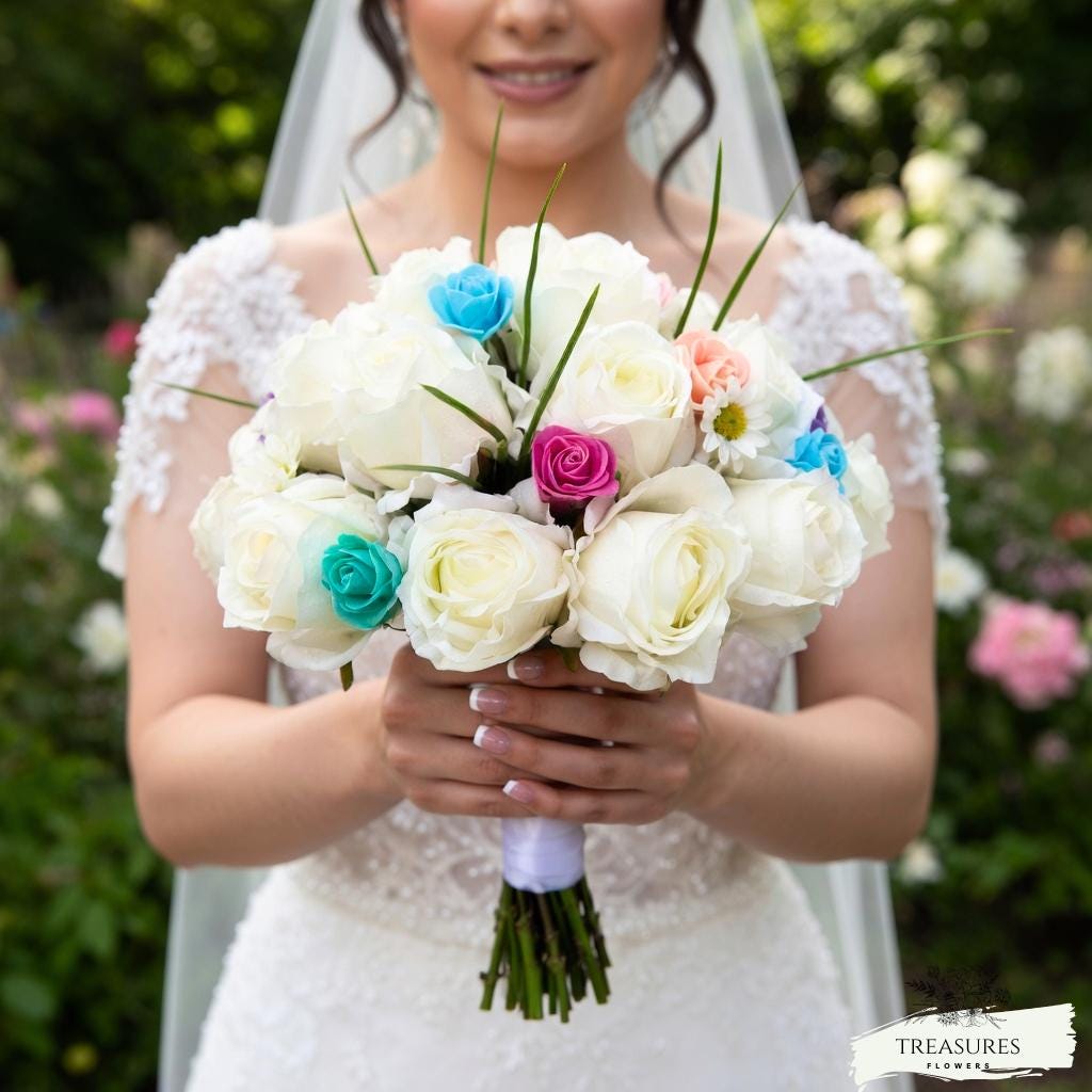 This beautiful garden Wedding Bouquet, made with the most realistic silk flowers available, was created with White Roses and tiny Roses in diferent colors and small white Daisies.
