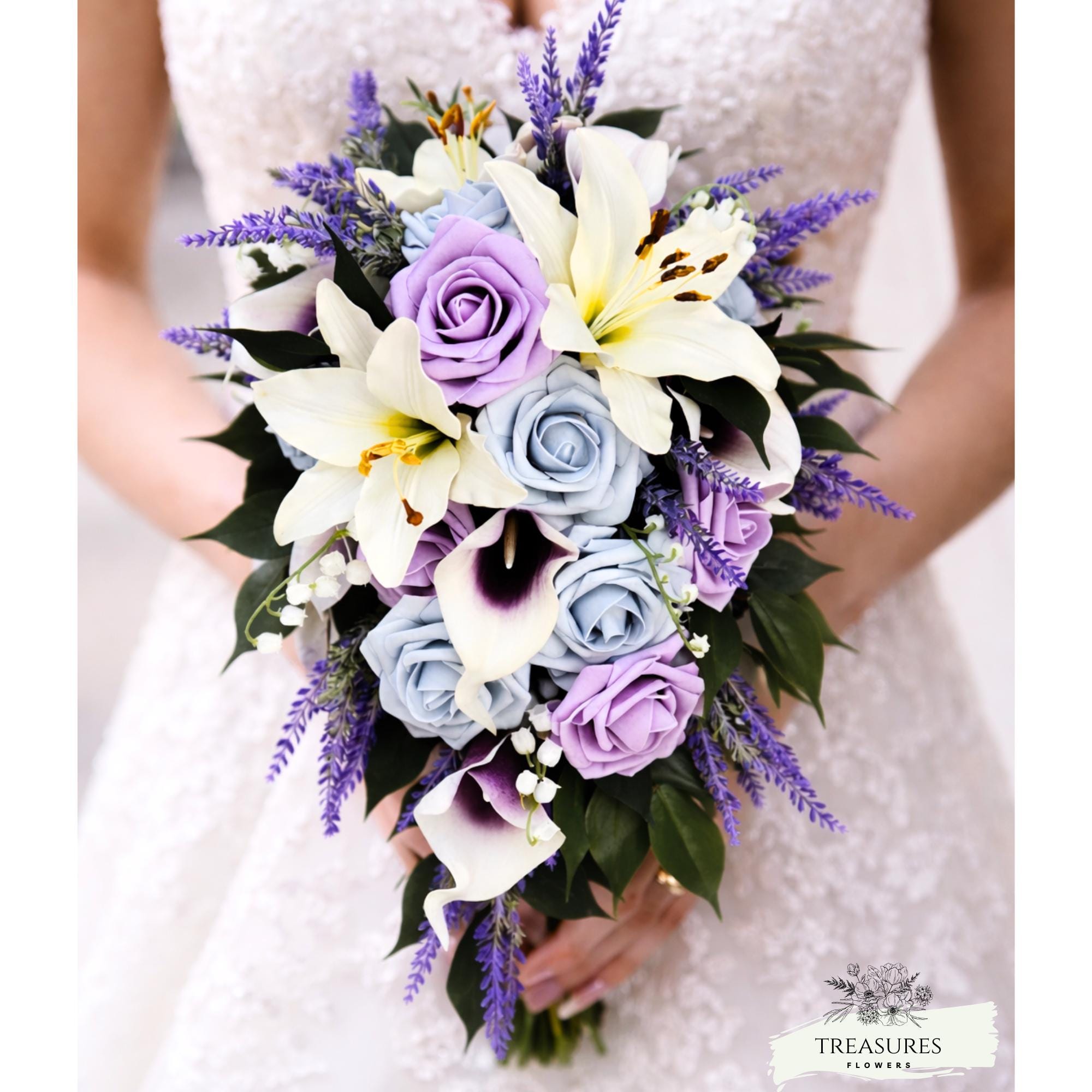 beautiful and unique Cascade Silk Bridal Bouquet, with White, Dusty Blue and Lavender Roses; Purple Heart Calla, White Lily, Lavender and Ficus. This Bouquet measuring approximate 18" long and approximate 10" across.