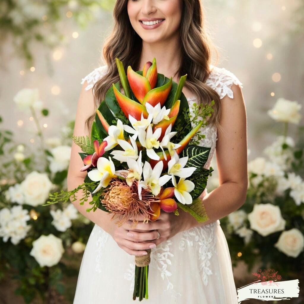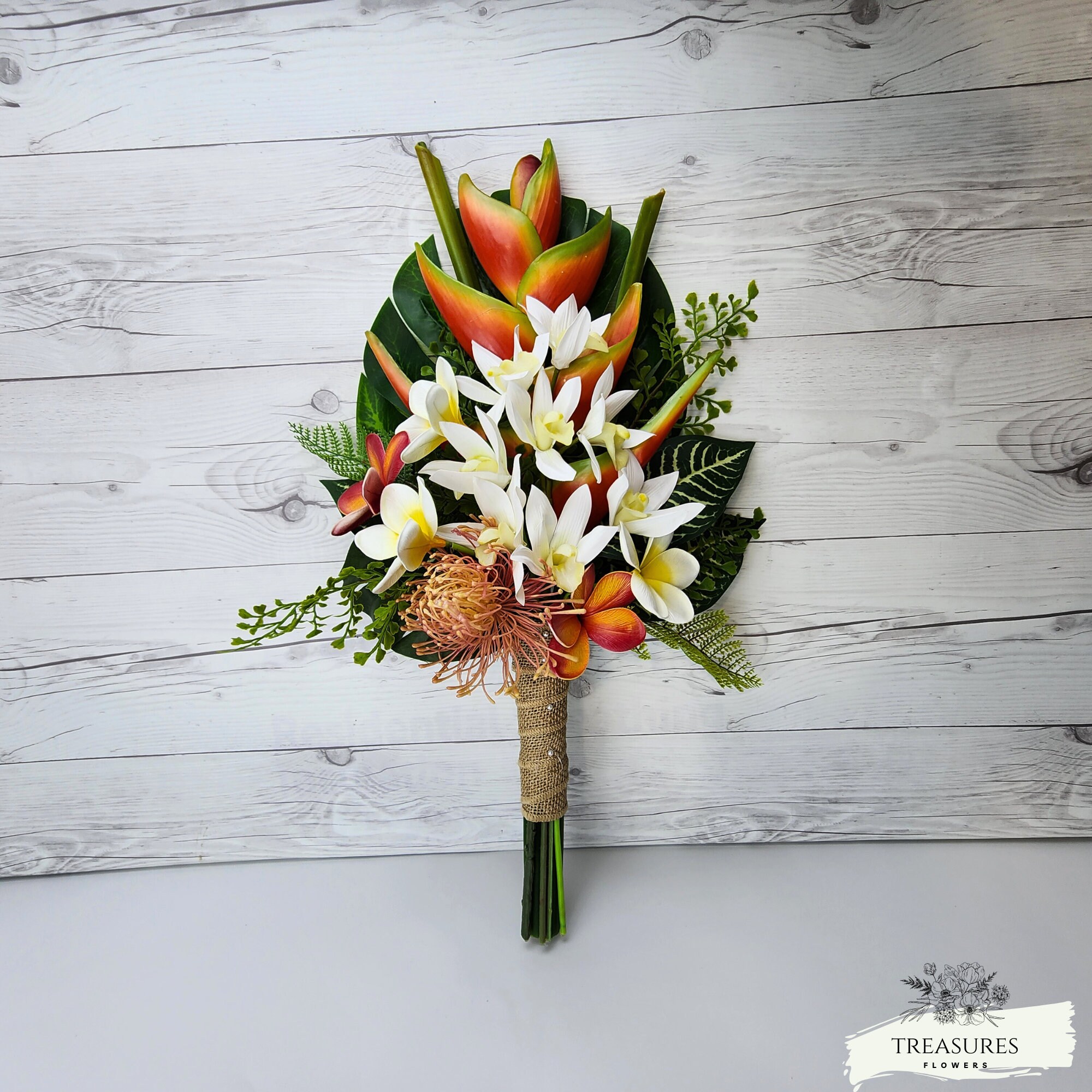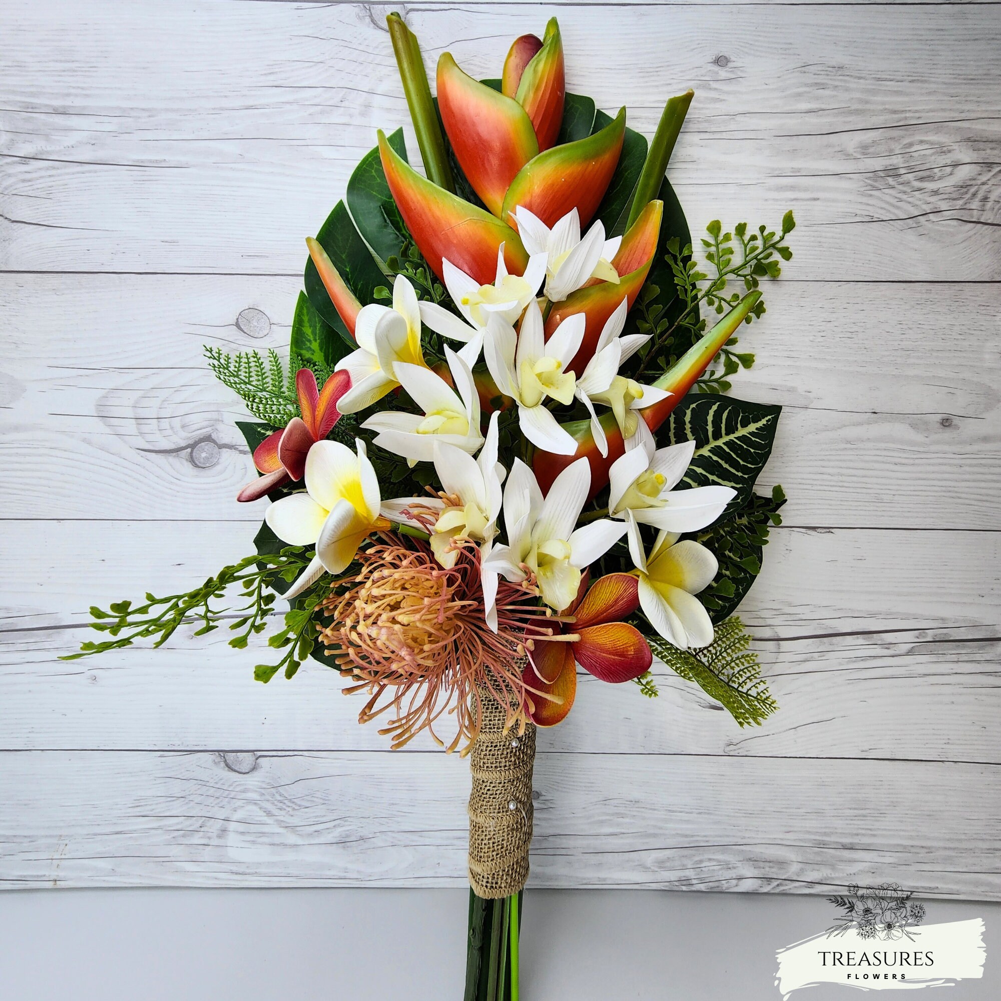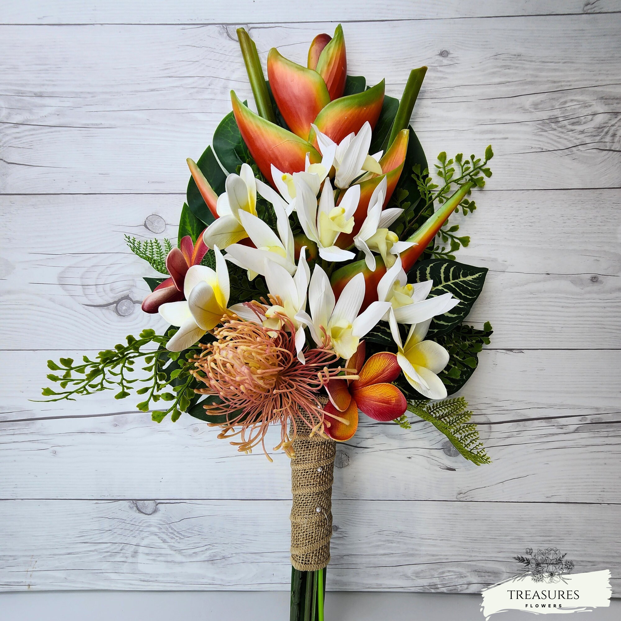 These beautiful and elegant front face bouquets are made with white Orchids, protea, Plumerias and Orange Heliconia together with tropical green.