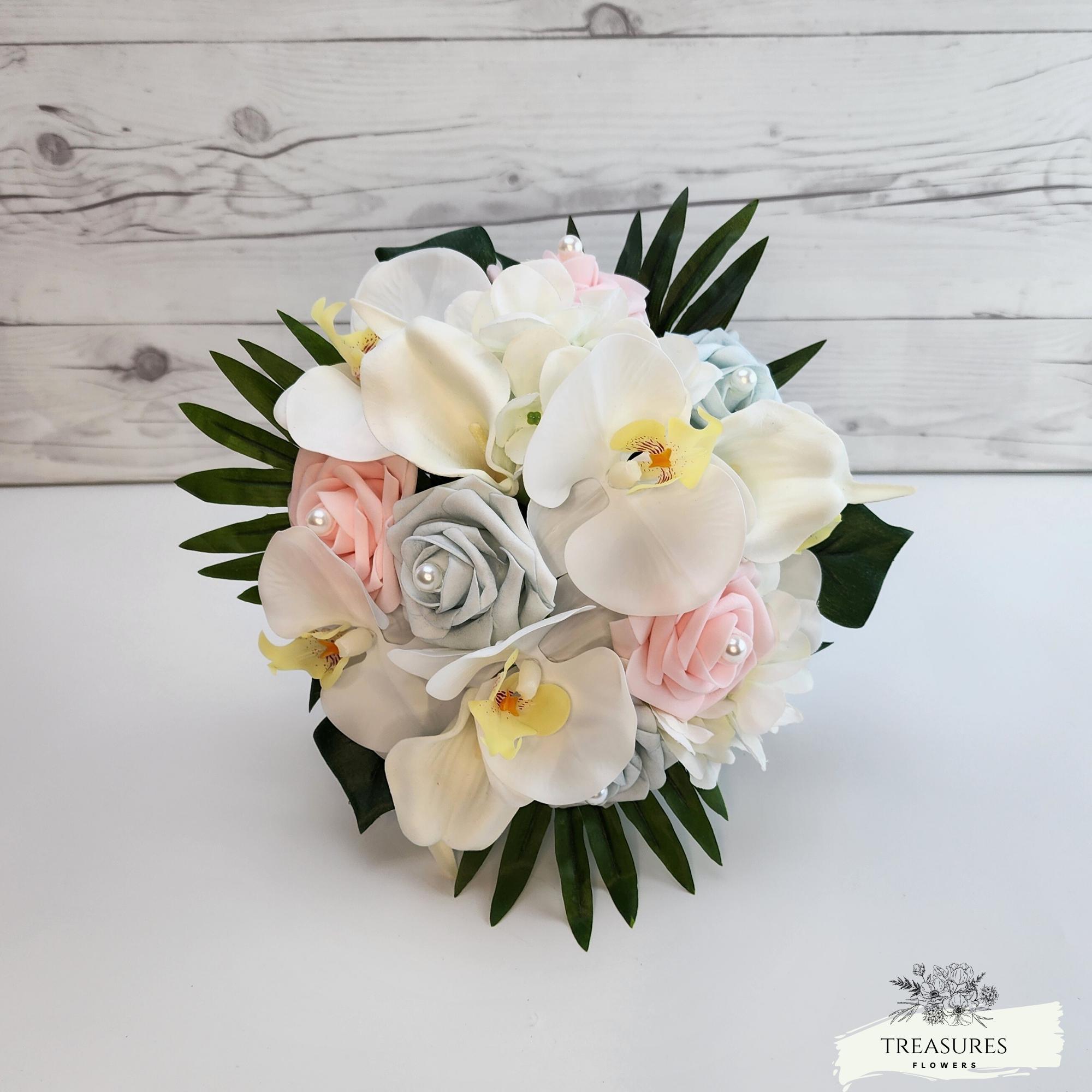 This stunning tropical Wedding Bouquet, made with the most realistic silk flowers available, was created with Light Blue and Pink Roses, White Orchid and Callas, accented with Tropical Leaves.