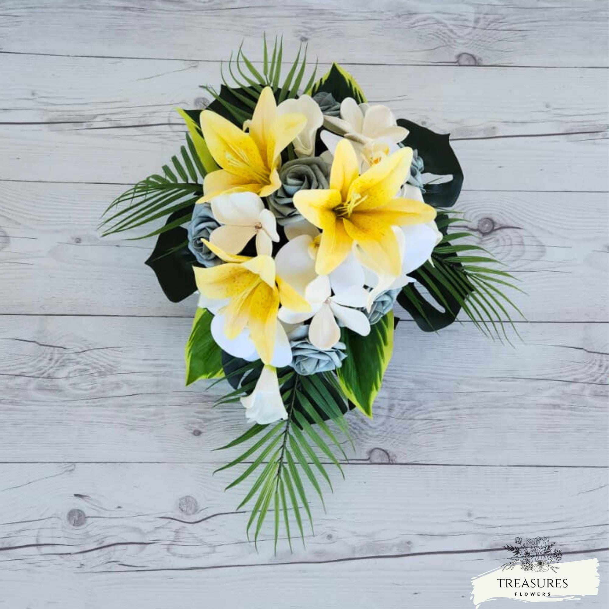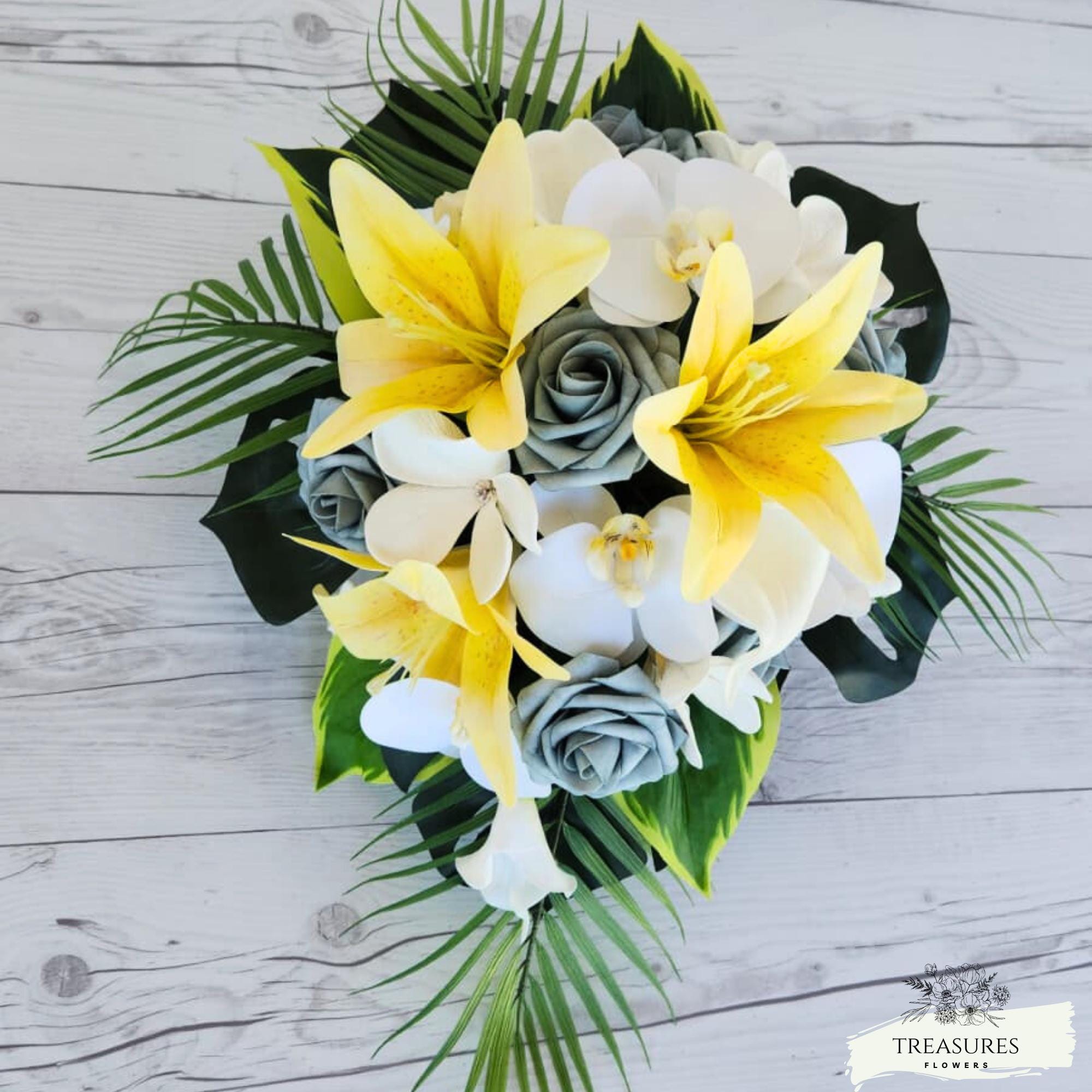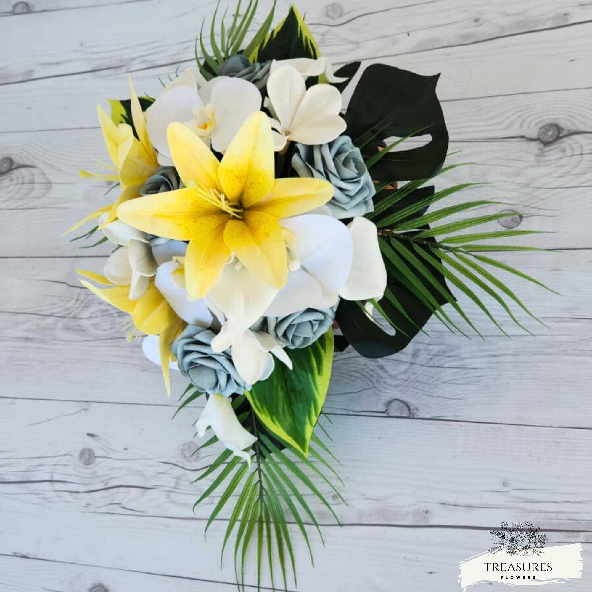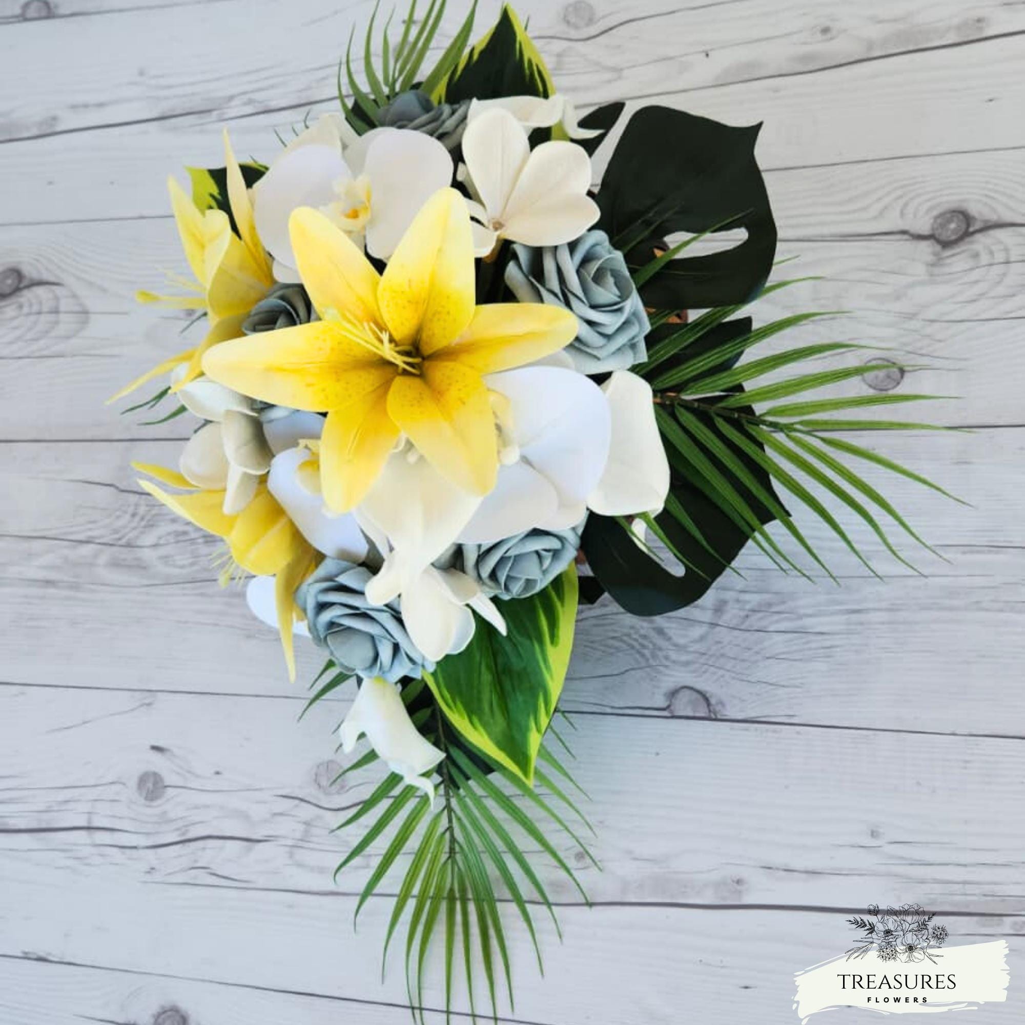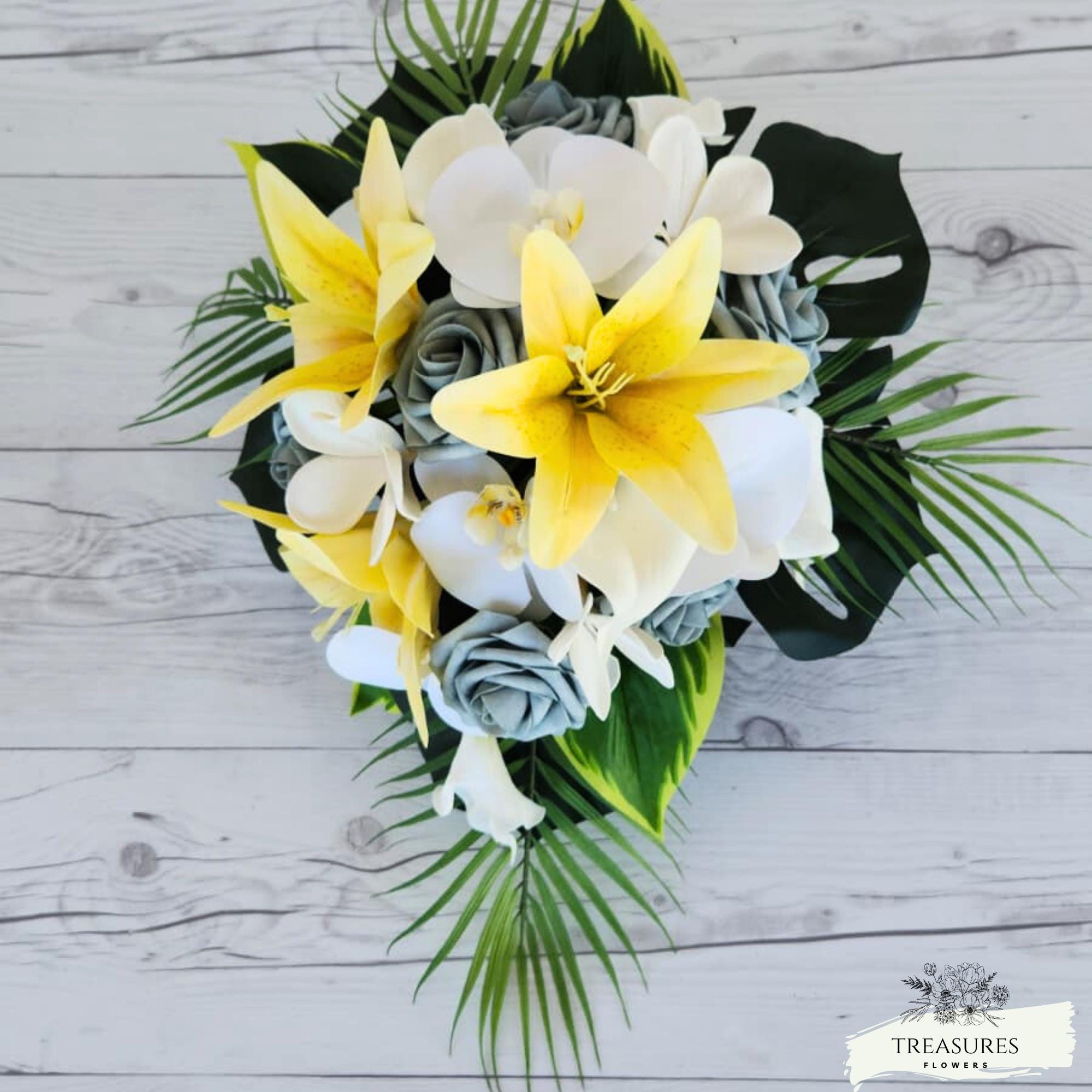 Beautiful and unique Cascade Silk Bridal Bouquet, yellow Lily, blue roses and white flower with Tropical Green. This Bouquet measuring approximate 22" long and approximate 21" across.