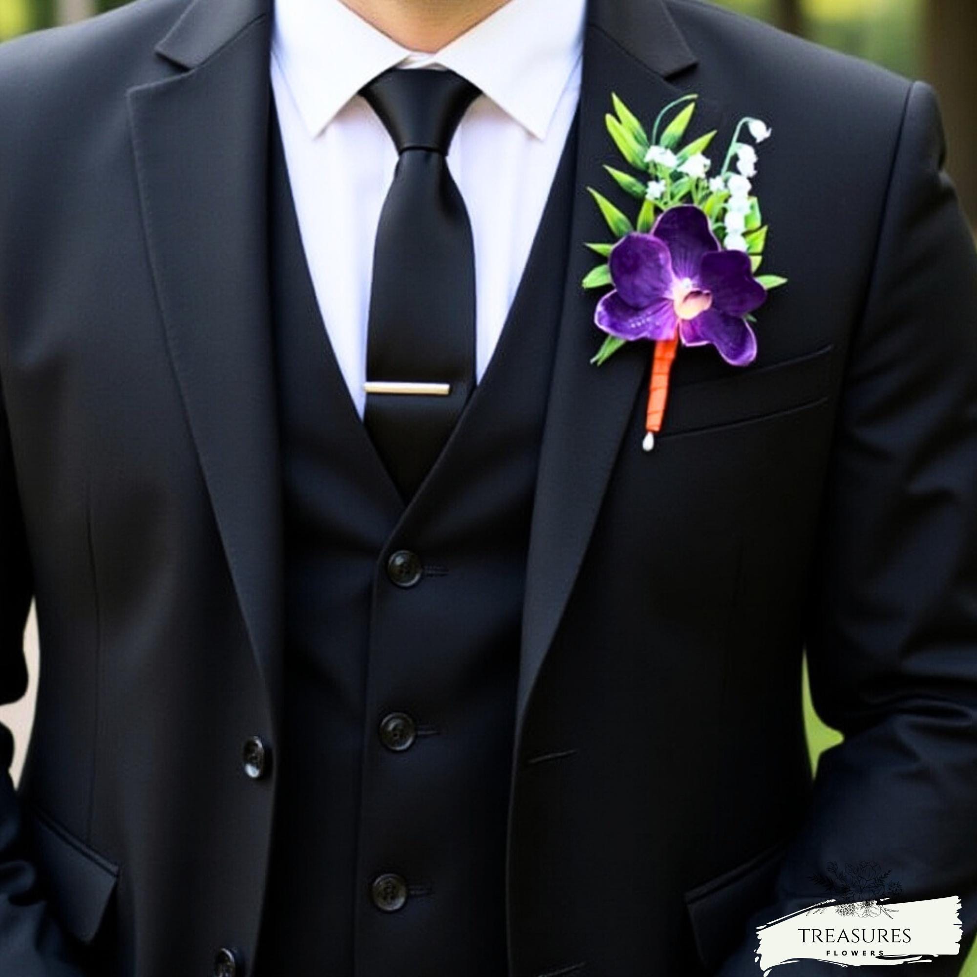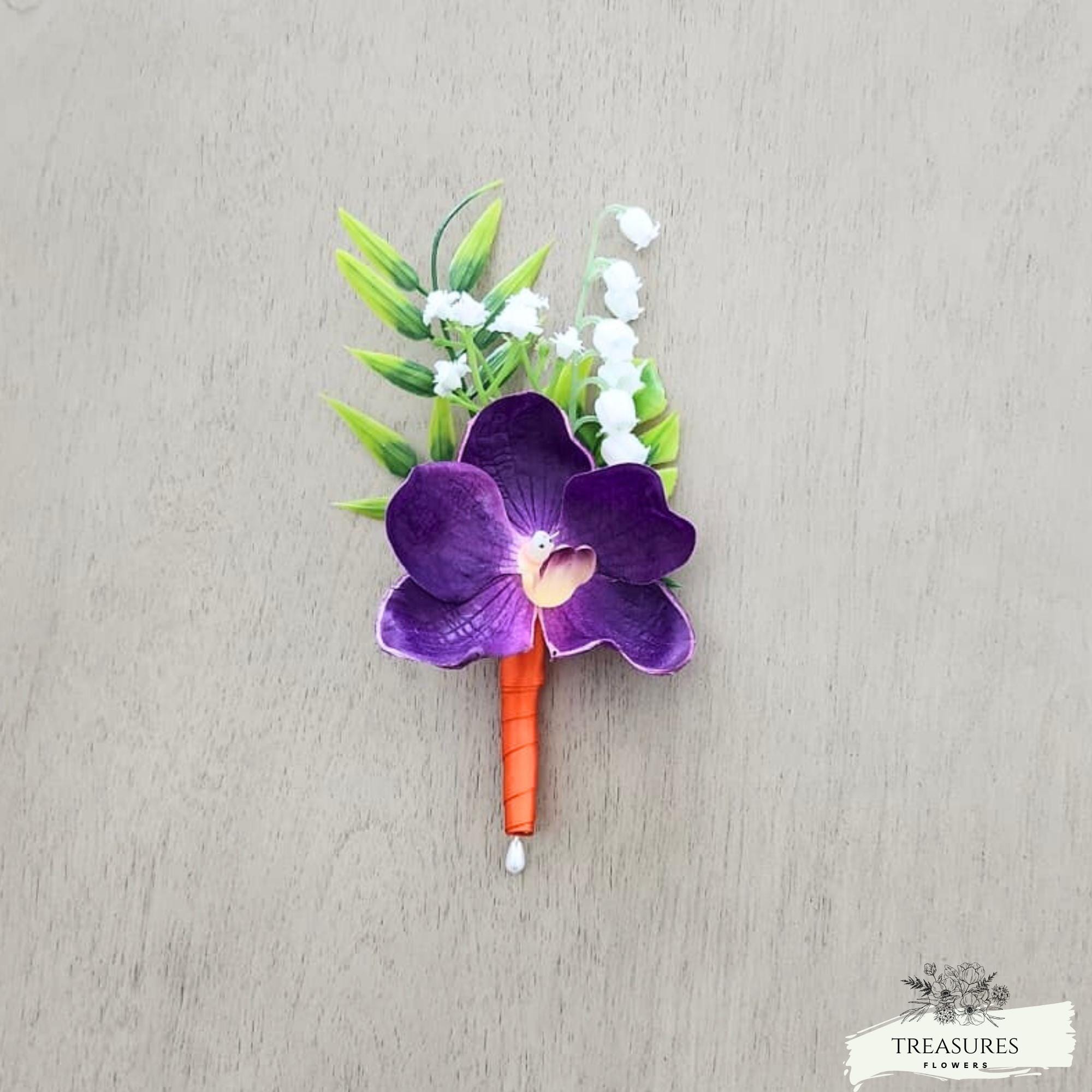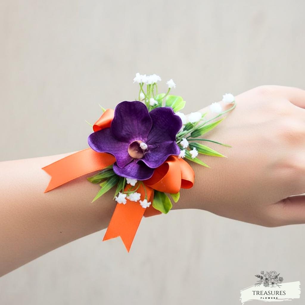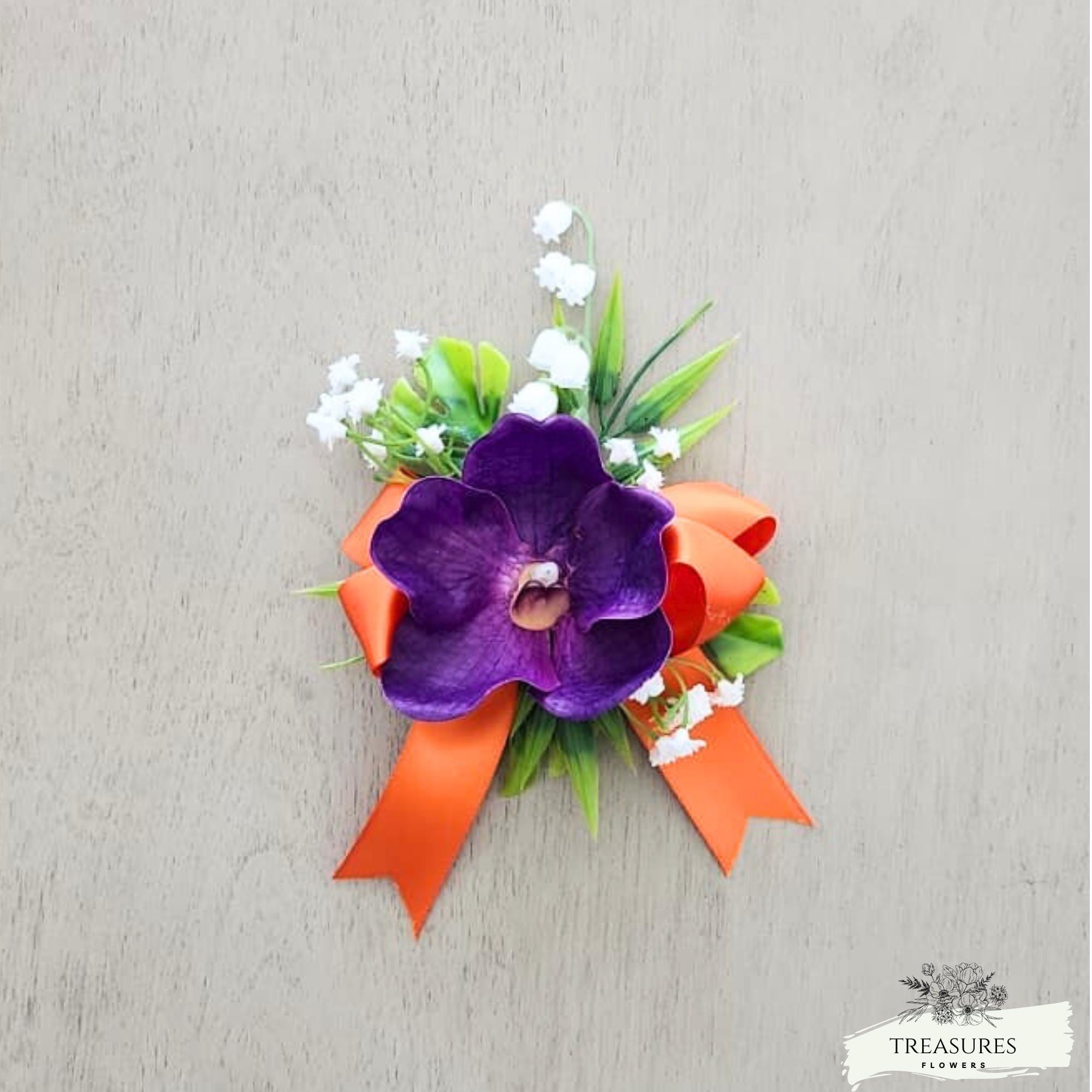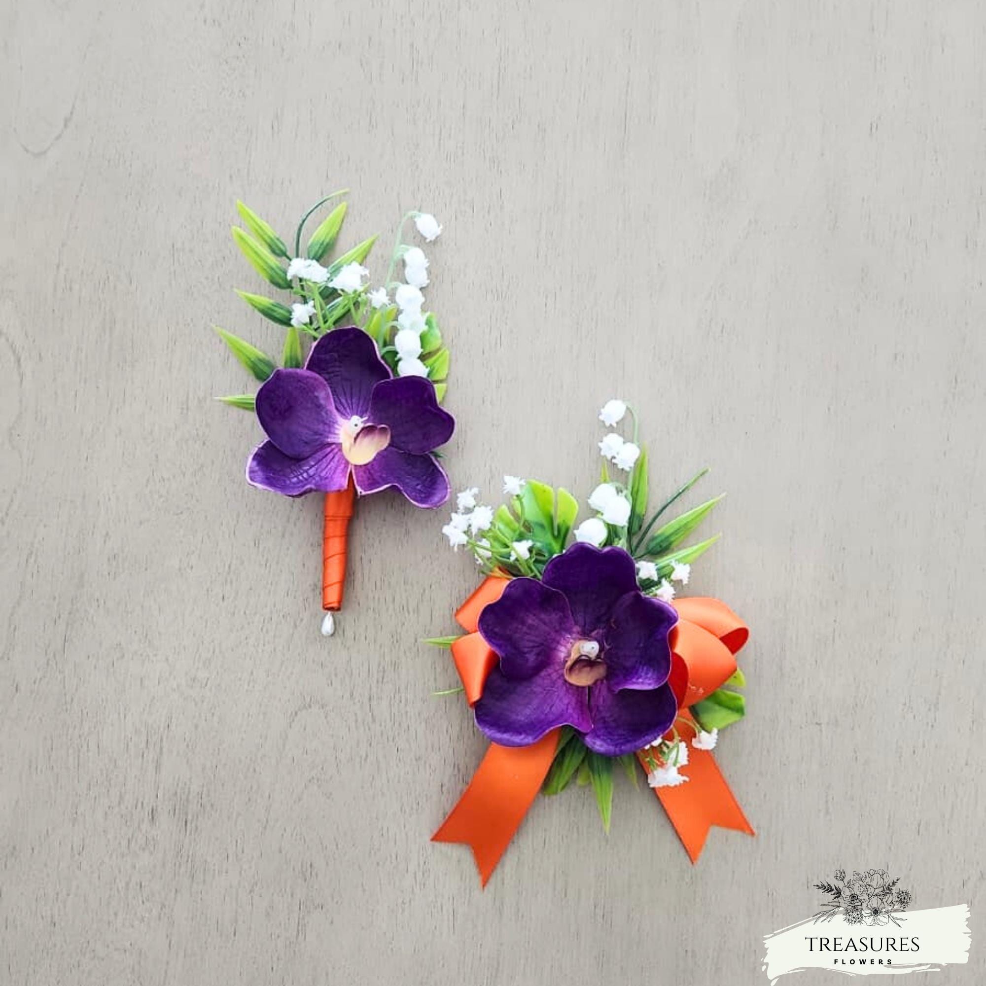 This beautiful Boutonniere and corsage are made with Real Touch Purple Orchid, fillers and green. This set was Finished with Orange Satin Ribbons. Ribbon color can be customized to your color scheme, just let me know in the customization section any changes will require our approval or you can write to us, and we will be happy to assist you with your custom order.