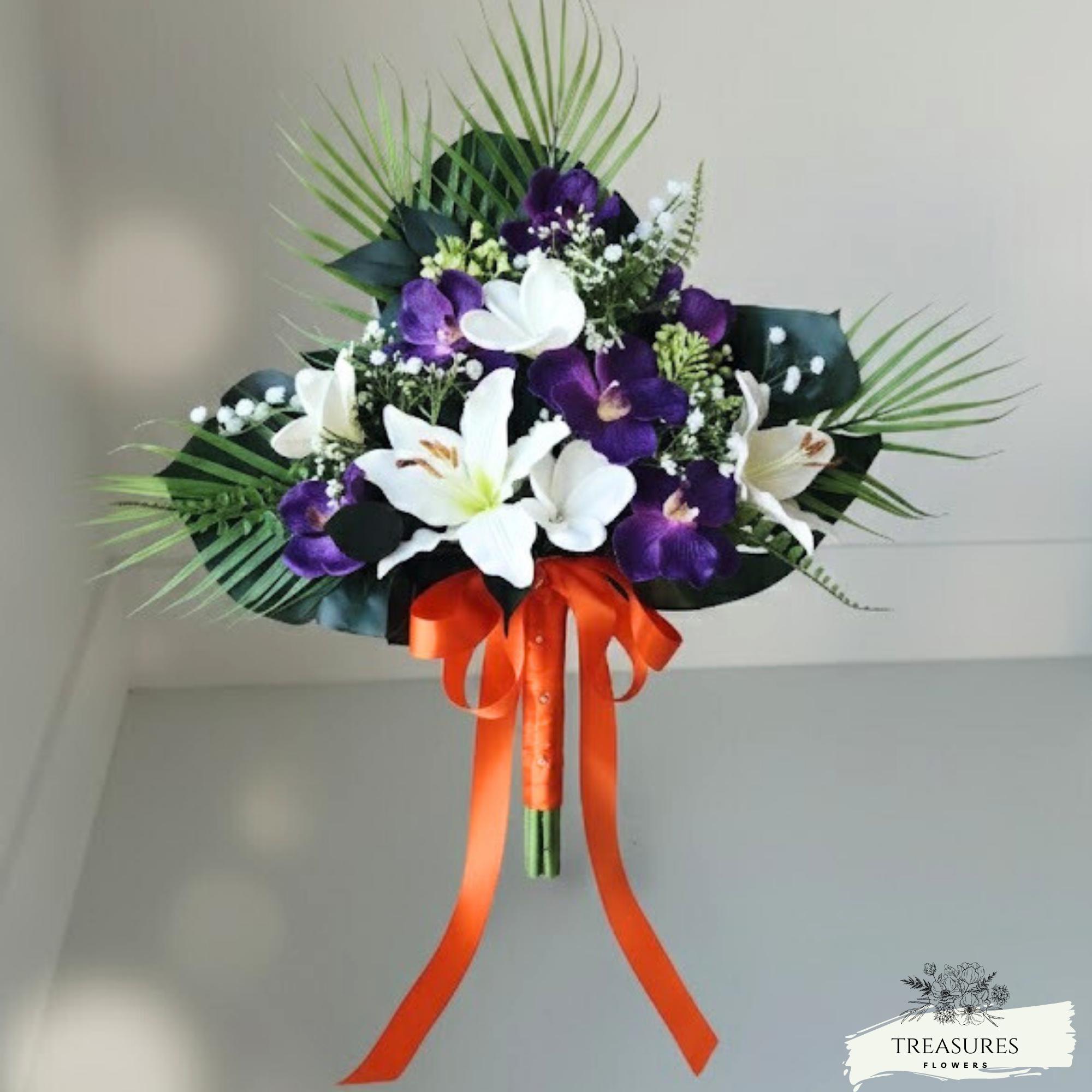 These beautiful and elegant front face bouquet is made with Purple Orchid, White Lilies, White Plumeria and a a mix of beautiful fillers together with tropical greenery.