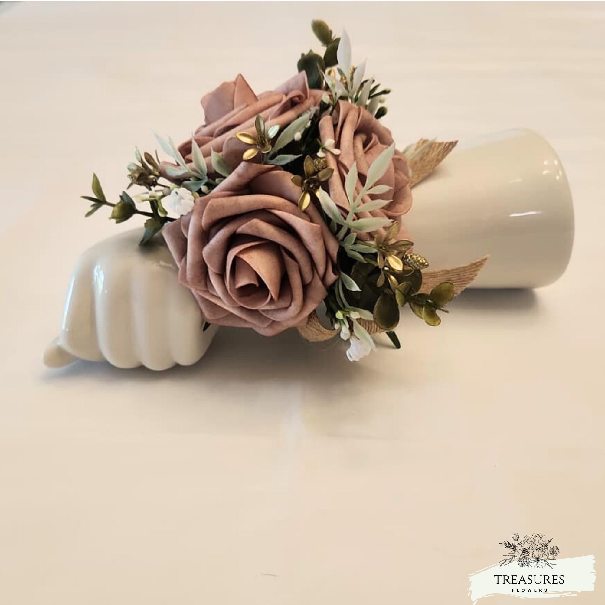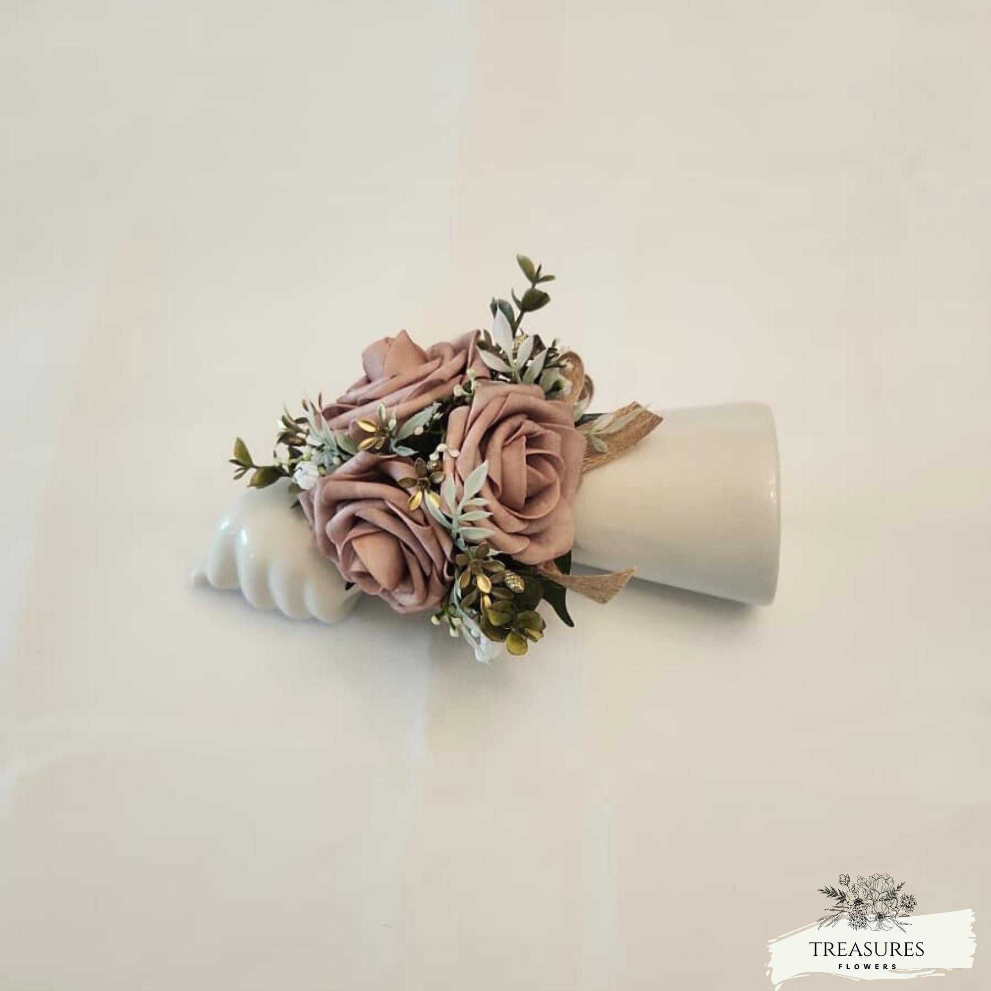 This beautiful Boutonniere and corsage are made with natural touch Mauve Roses, Eucalyptus Greenery, Gold Filler and Baby's Breath. This set was Finished with burlap Satin Ribbons. Ribbon color can be customized to your color scheme, just let me know in the customization section any changes will require our approval or you can write to us, and we will be happy to assist you with your custom order.