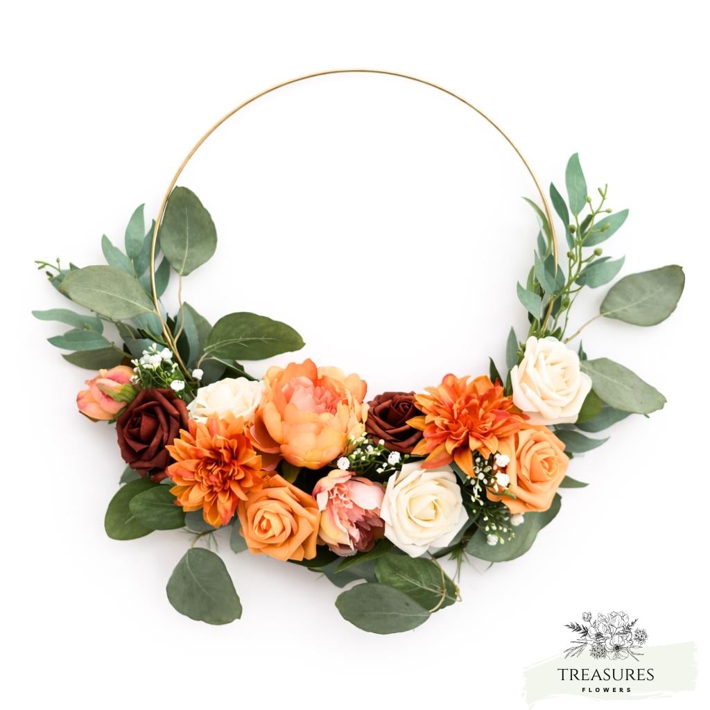 Floral hoop bouquet: The most reusable wedding accessory. These beautiful floral hoops make the perfect alternative for flower girls gift basket, lightweight and easy to hold they make an ideal floral accessory. Made out of high-quality floral. Assortment of Roses and Peonies in Orange, Terracotta and Ivory with Eucalyptus.