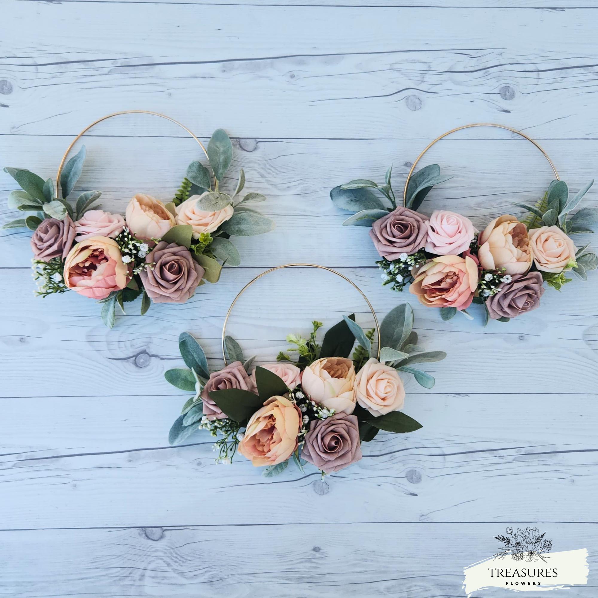 Floral hoop bouquet: The most reusable wedding accessory. These beautiful floral hoops make the perfect alternative for flower girls gift basket, lightweight and easy to hold they make an ideal floral accessory. Made out of high-quality floral. Assortment of Roses and Peonies in blush, peach, mauve with lamb ear.