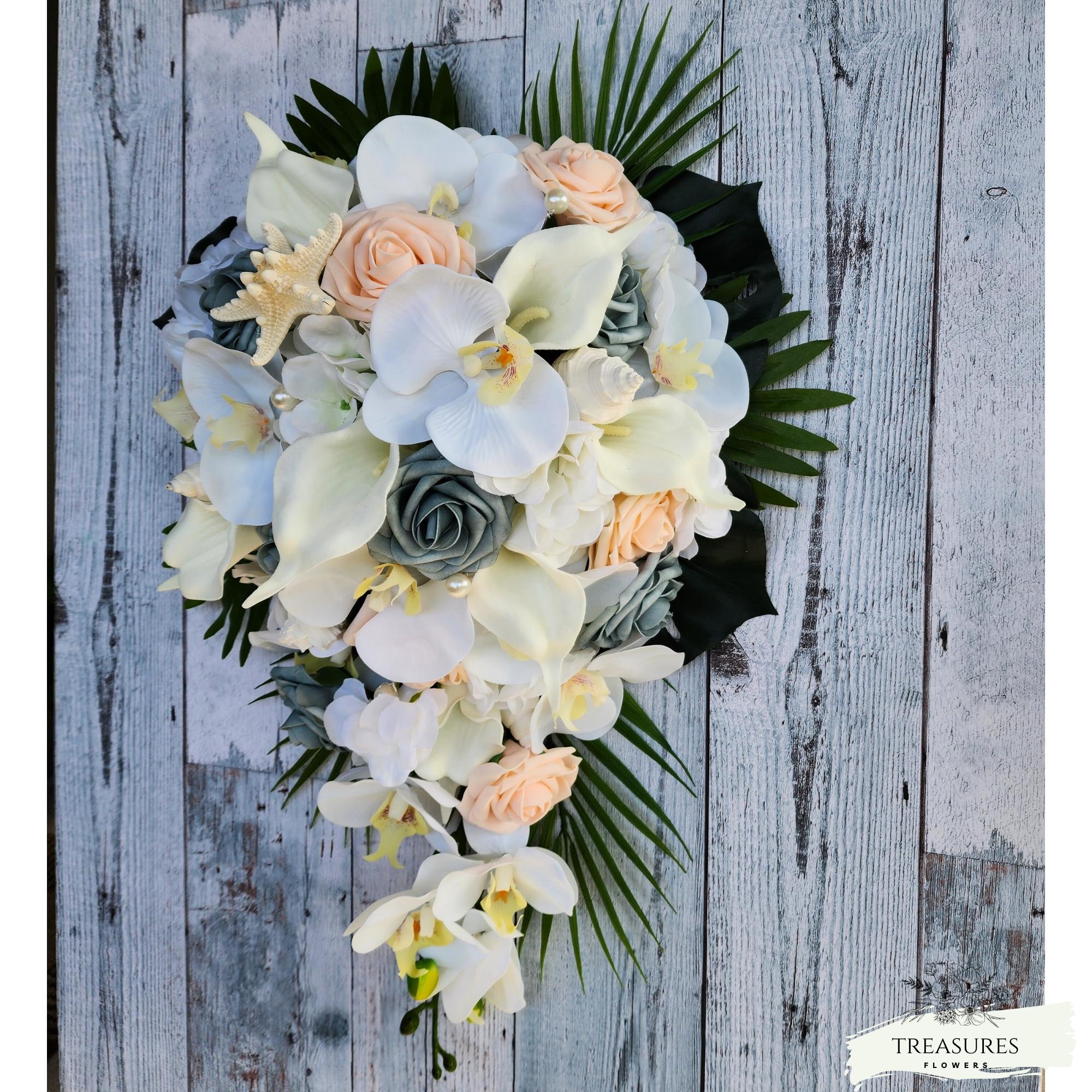 This stunning tropical Wedding Cascade Bouquet, made with the most realistic silk flowers available, was created with Dusty Blue and Blush Roses, White Orchid and Callas, accented with Pearls, Natural Star Fish, Seashells and Tropical Leaves.