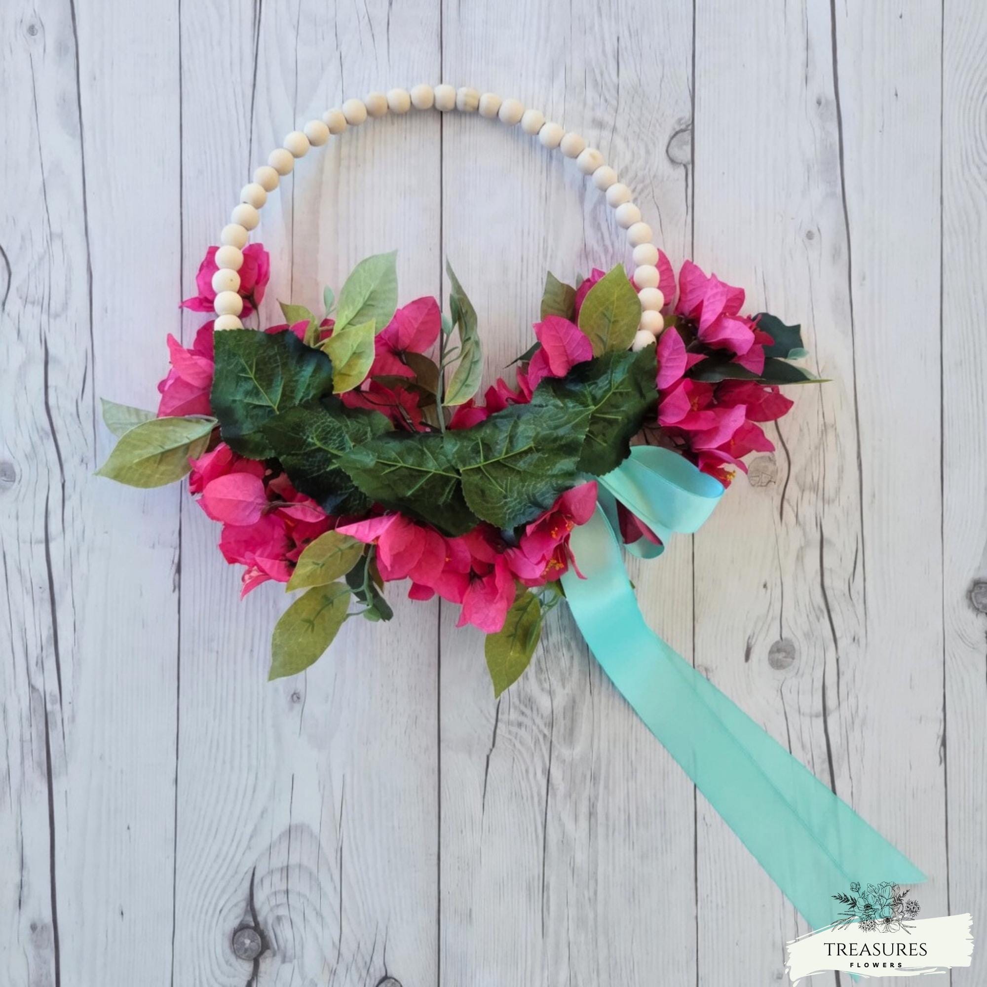 Floral hoop bouquet: The most reusable wedding accessory. These beautiful floral hoops make the perfect alternative for flower girls gift basket, lightweight and easy to hold they make an ideal floral accessory. Made out of high-quality floral. Assortment of Fuchsia Bougainvillea and White Roses.