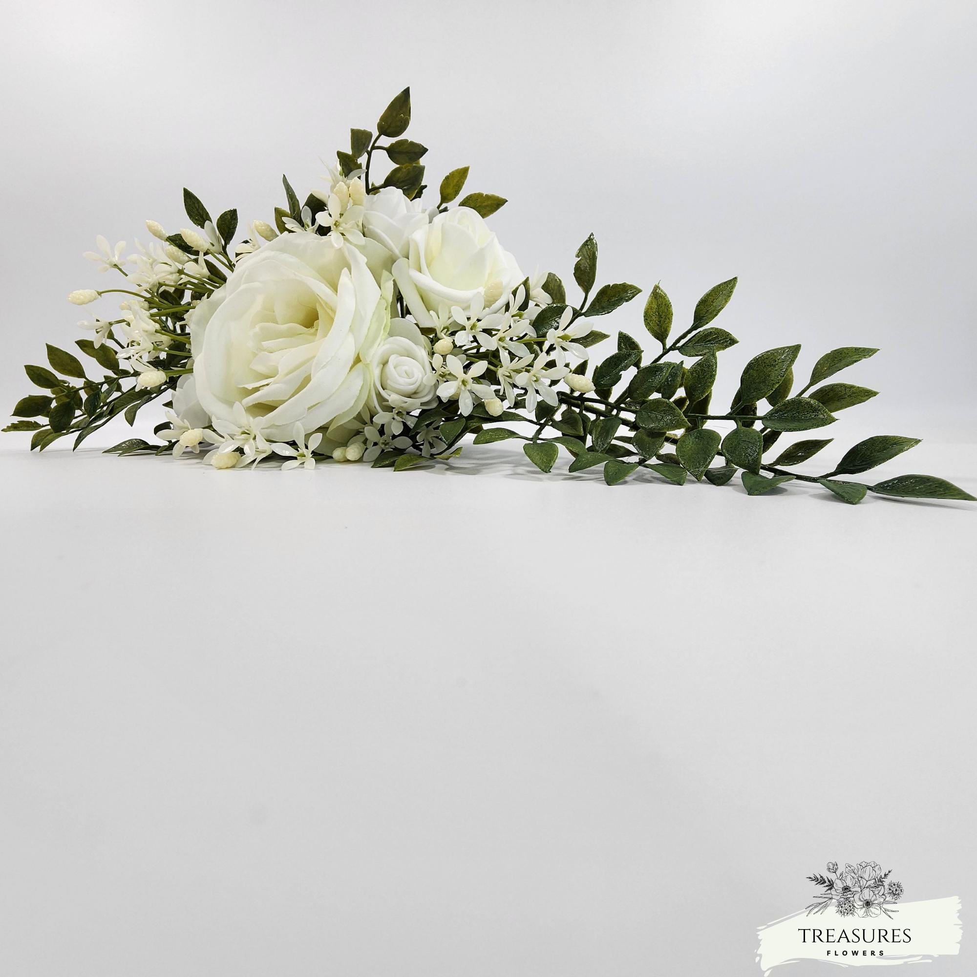 Made with white roses of different sizes, Fillers and greenery.