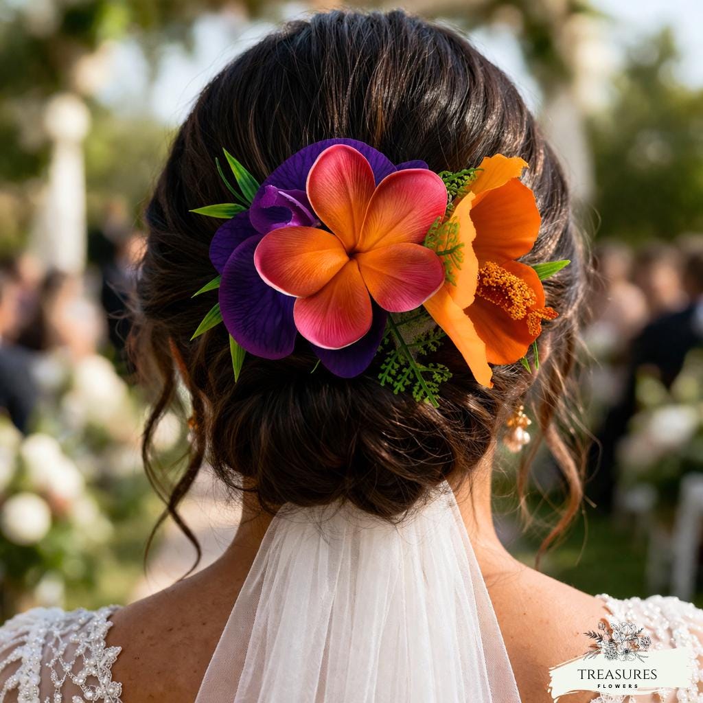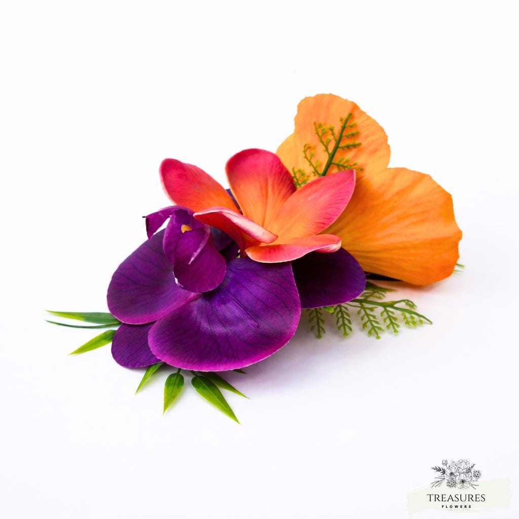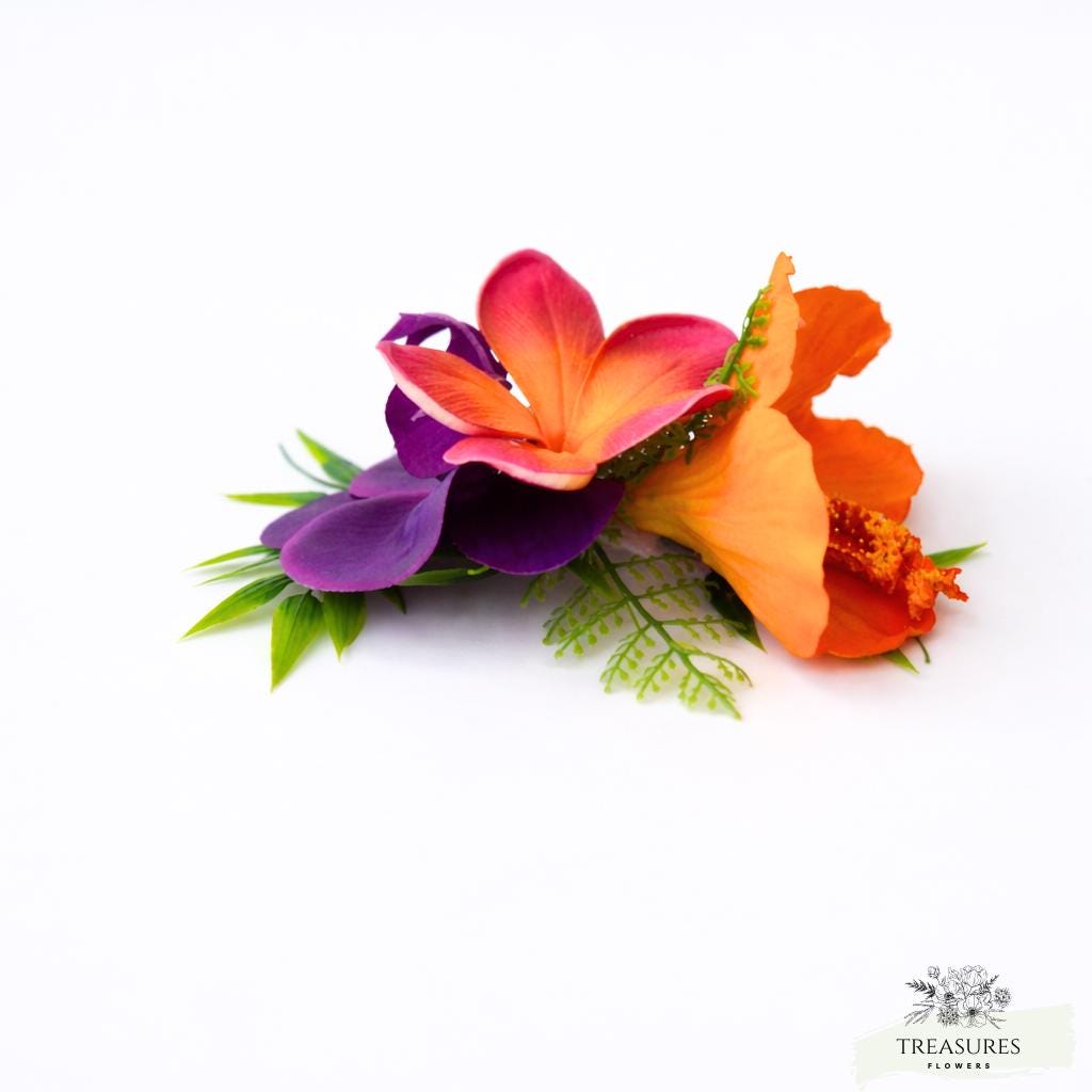 Simple, elegant and so tropical headpiece It's made with orange hibiscus, fuchsia Plumeria, purple orchid, Tropical Greenery and fillers. You can choose between an alligator clip or a clear comb. This hair piece is easy to attach and secure once in place.