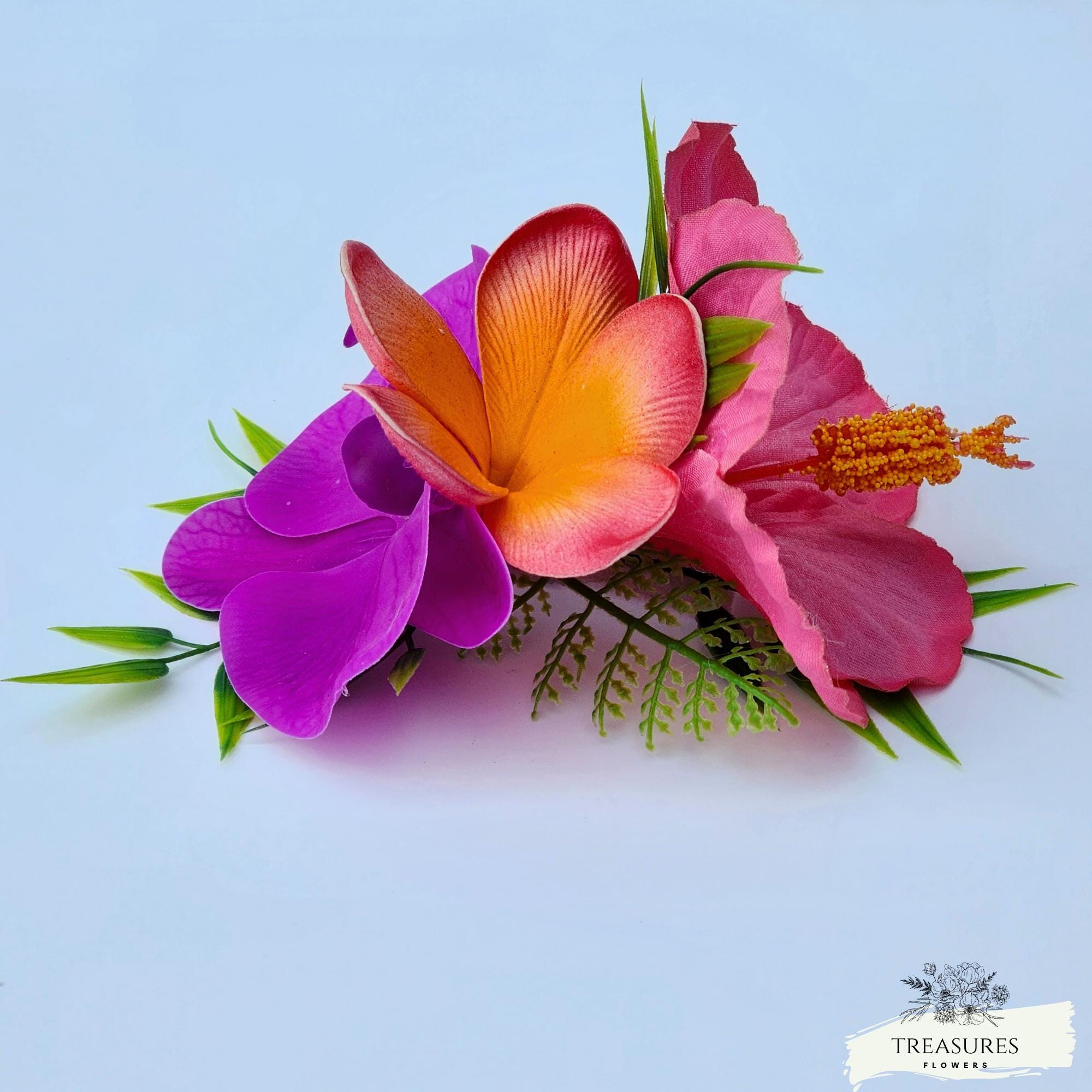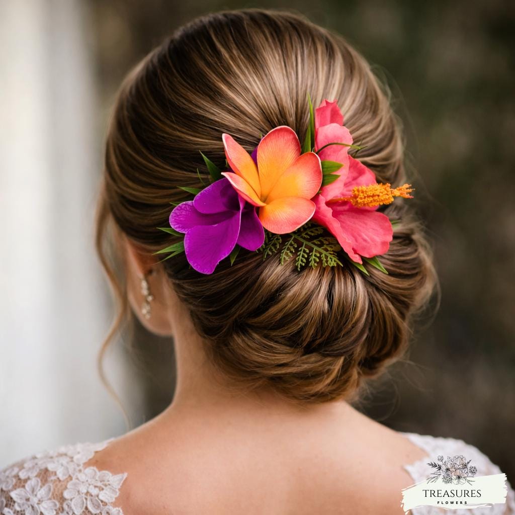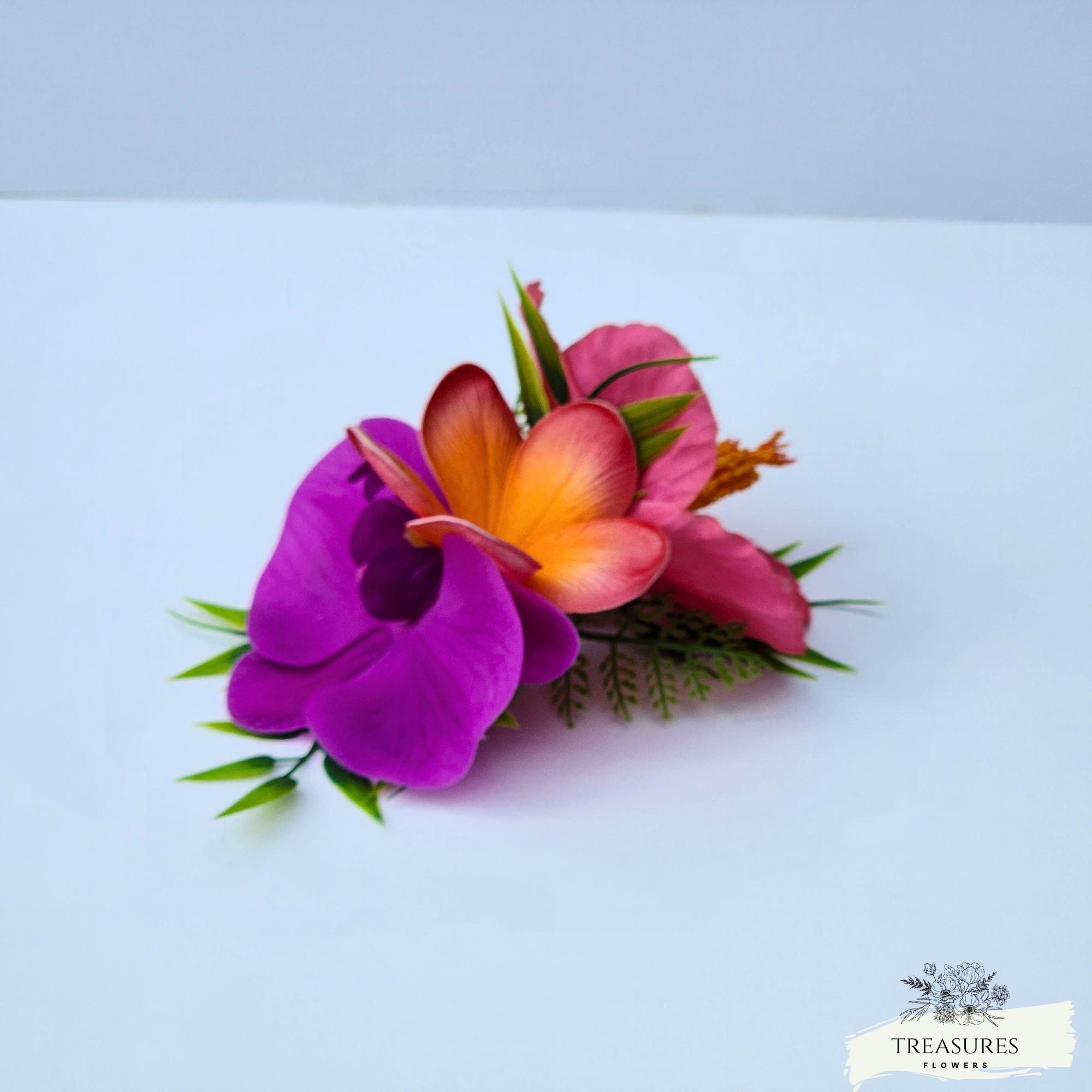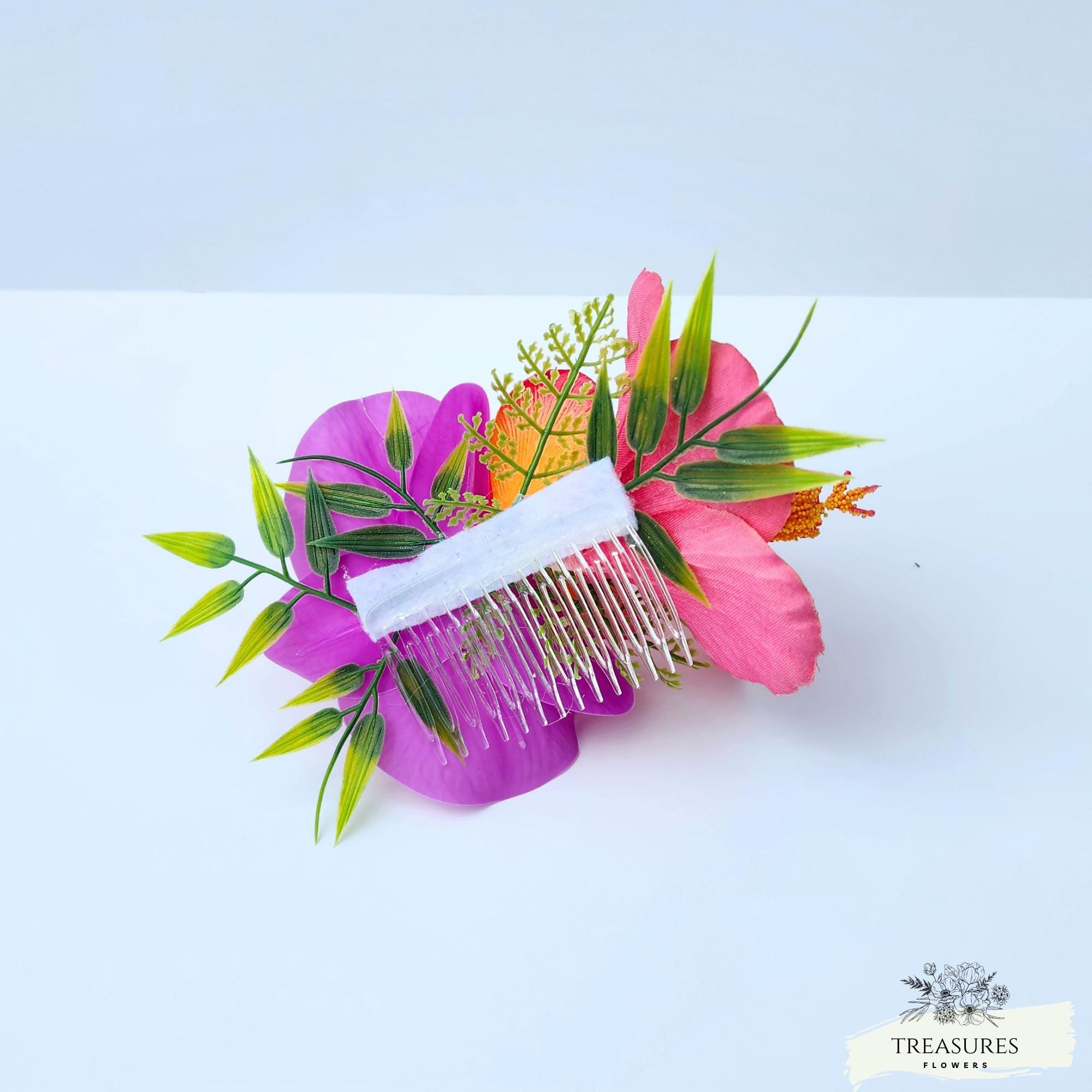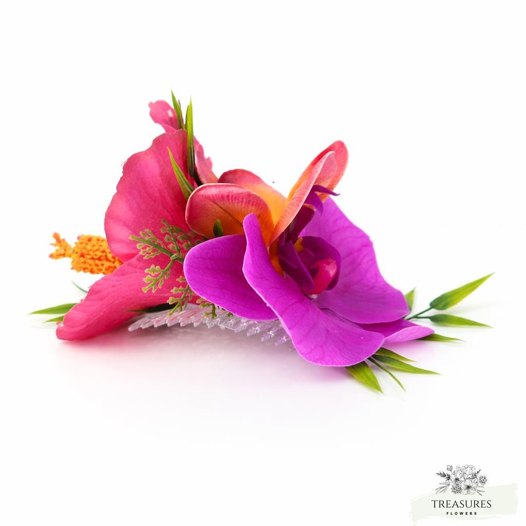 Simple, elegant and so tropical headpiece It's made with pink hibicus, orange Plumeria, fuchsia orchid, Tropical Greenery and fillers. You can choose between an alligator clip or a clear comb. This hair piece is easy to attach and secure once in place.