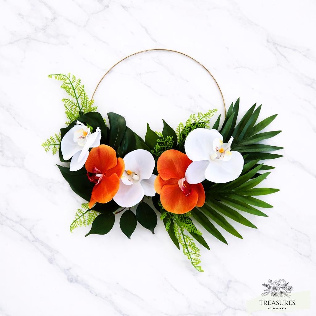 Add a touch of tropical elegance to your space with this stunning Orange & White Orchid Hoop Wreath. Designed with lifelike orchids in vibrant orange and soft white tones, this modern floral ring brings a fresh, sophisticated look to any setting.