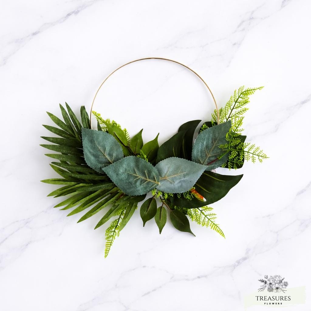 Perfect for weddings, bridal showers, or home décor, this handcrafted hoop arrangement features lush greenery and a sleek gold ring that creates a contemporary and stylish aesthetic. Whether used as a ceremony backdrop, wall decoration, or statement piece, it effortlessly enhances any environment with its natural beauty.