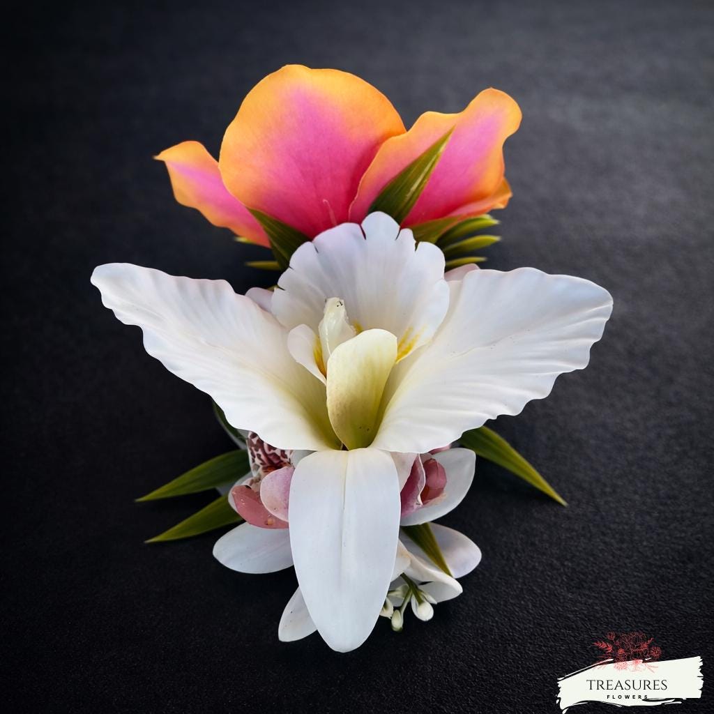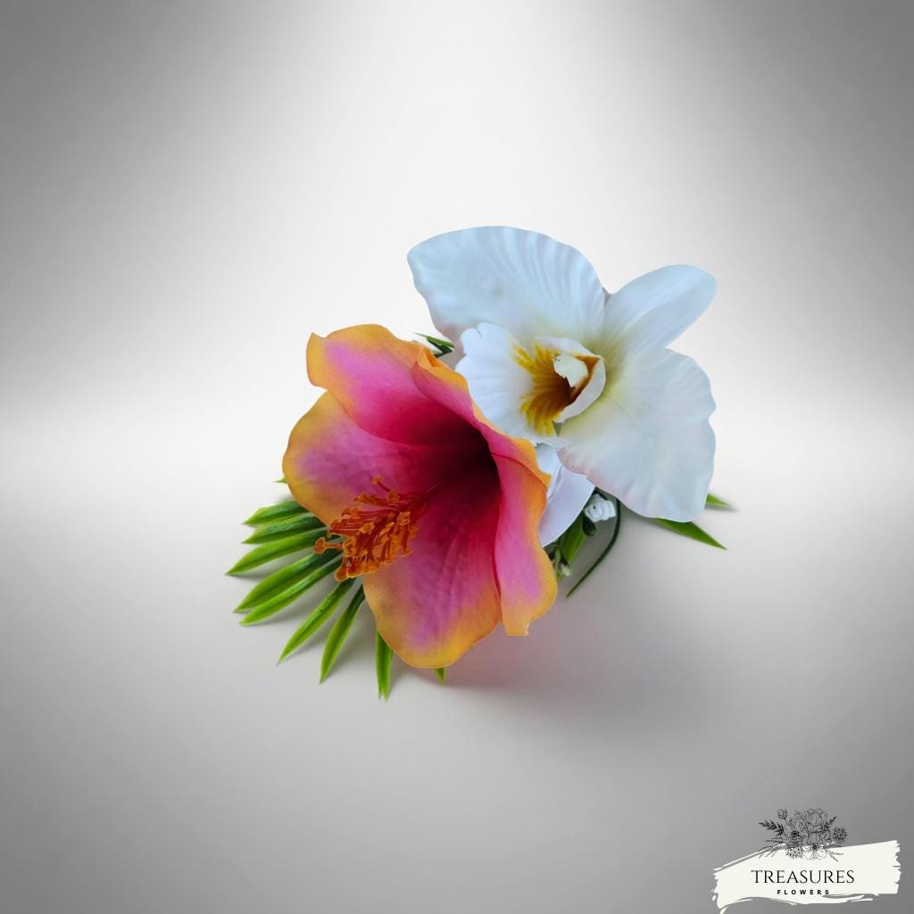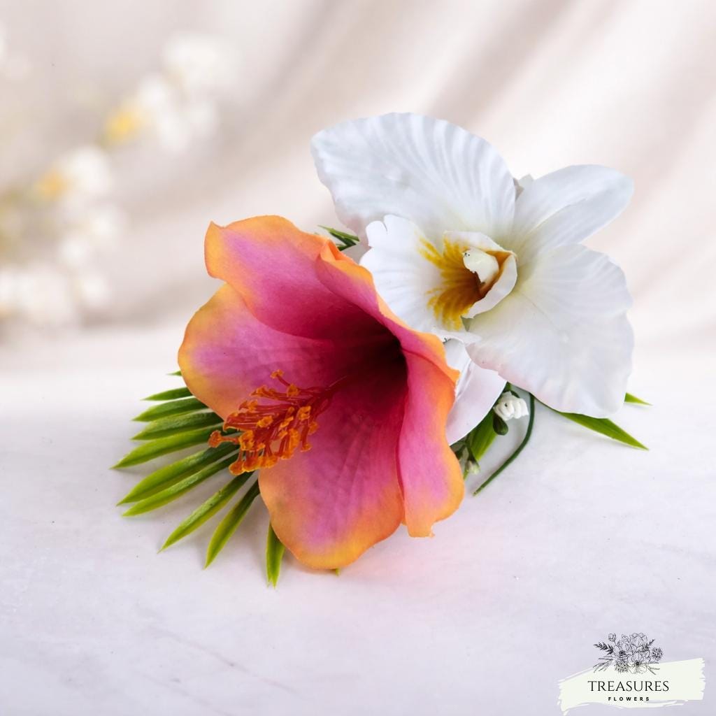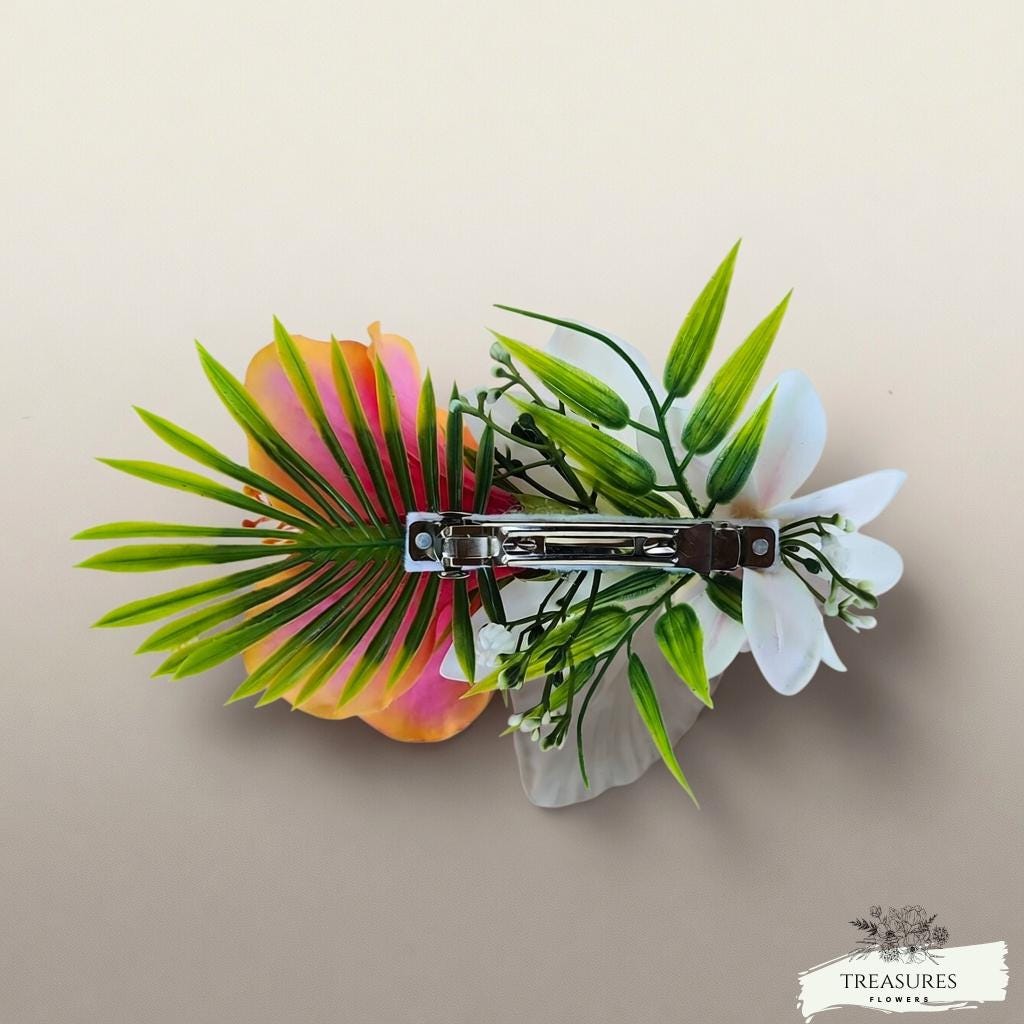 Add a touch of paradise to your wedding day with this stunning tropical floral hair piece. Featuring a vibrant gradient hibiscus flower in shades of pink, orange, and yellow, paired with a delicate white Orchid and lush green palm leaves, this hair accessory brings a romantic, island-inspired elegance to any bridal look.