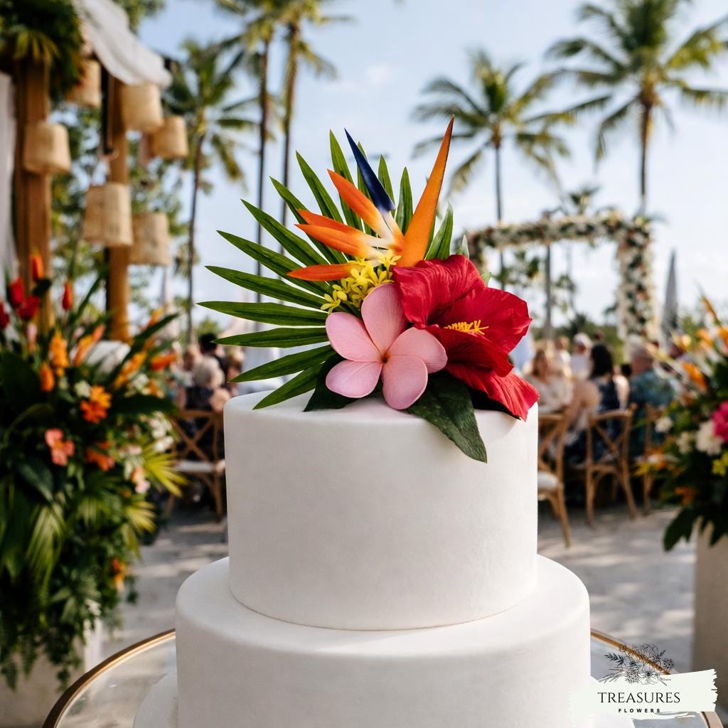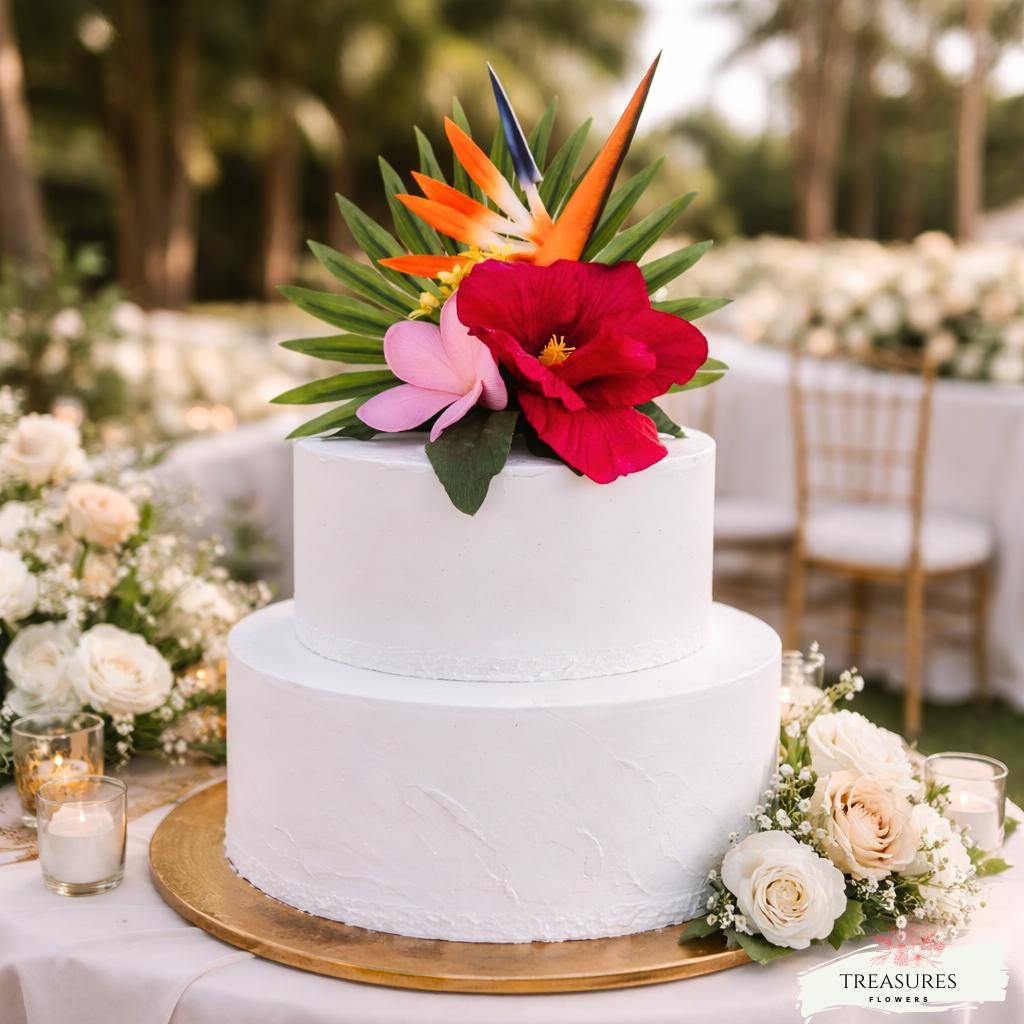 Add a touch of tropical elegance to your wedding with this stunning modern floral cake decoration. Featuring vibrant hibiscus, bird of paradise, and delicate tropical greenery, this design brings a fresh, sophisticated, and minimalist look to any wedding cake.